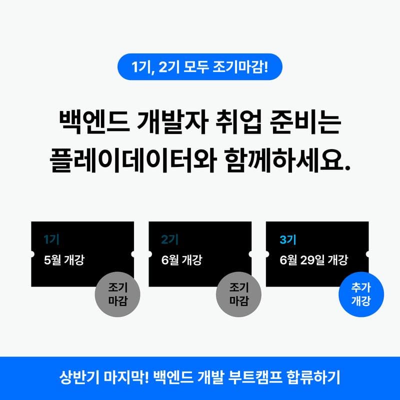 ✨백엔드 부트캠프도 역시 오프라인✨ 플레이데이터가 백엔드 부트캠프 1,2기 조기마감! 3기를 추가 오픈하였습니다. 백엔드 기초부터 MSA와 CI/CD 꽉꽉 눌러담아 비전공자도 매력적인 백엔드 개발자로 만들어 드립니다! 📢3기도 선착순 30명 선발 마감! 지금 신청하세요