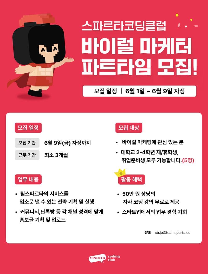 ✔️ 모집기간 : 2023. 06. 01. (월) \~ 2023. 06. 09. (금) ✔️ 업무 내용 : 팀스파르타 서비스를 입소문 낼 수 있는 전략 기획 및 실행 등 ✔️ 타겟 :대학교 2-4학년 재/휴학생, 취업 준비생 모두 가능 ✔️ 지원자격 : 바이럴 마케팅에 관심 있는 누구나자세한 내용은 채용 안내 페이지에서 확인 가능합니다.