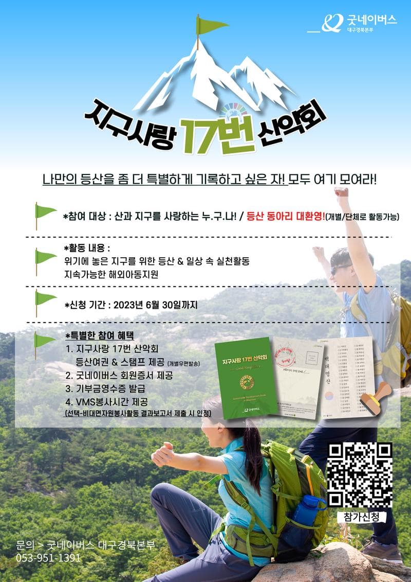 지속가능발전목표(SDGs)는 미래를 지키며 현재의 발전을 이루기 위해 UN과 전 세계가 정한 국제적 약속입니다. ‘단 한 사람도 소외되지 않은 것’(Leave No One Behind)의 슬로건으로 17가지 주목표 169개 세부목표가 있습니다. [지구사랑17번 산악회]는 17가지의 목표를 기억하고 실천하기 위해 기획되었습니다. 지속가능한 지구 만들기 프로젝트! 등린이, 등산러버, 산을 사랑하는 누구나 신청가능!! ⚑ 참여대상 산을 사랑하는 누.구.나 !!! ⚑ 활동내용 ‘등산여권’으로 위기에 놓인 지구를 위한 등산 & 일상 속 실천 활동 지속가능한 해외아동지원(월 2만원 정기후원) ⚑ 신청기간 2023년 6월 30일(금)까지 ⚑ 특별한 혜택 지구사랑 17번 산악회 키트 제공 *등산여권&도장 제공 굿네이버스 회원증서 제공 기부금영수증 발급 VMS 봉사시간제공(선택-비대면자원봉사활동 결과보고서 제출 시 인정) ⚑ 신청방법 포스터에 있는 QR코드[https://forms.gle/SgW7fa9mvZUGVPBu6]로 신청가능 ⚑ 문의 굿네이버스 대구경북본부 최미선 대리 053-951-1391 ⚑ 좀 더 알아보기! 굿네이버스 대구경북본부 한빛 인스타그램 https://www.instagram.com/p/Cs8j23JSb6p/?igshid=MzRlODBiNWFlZA==