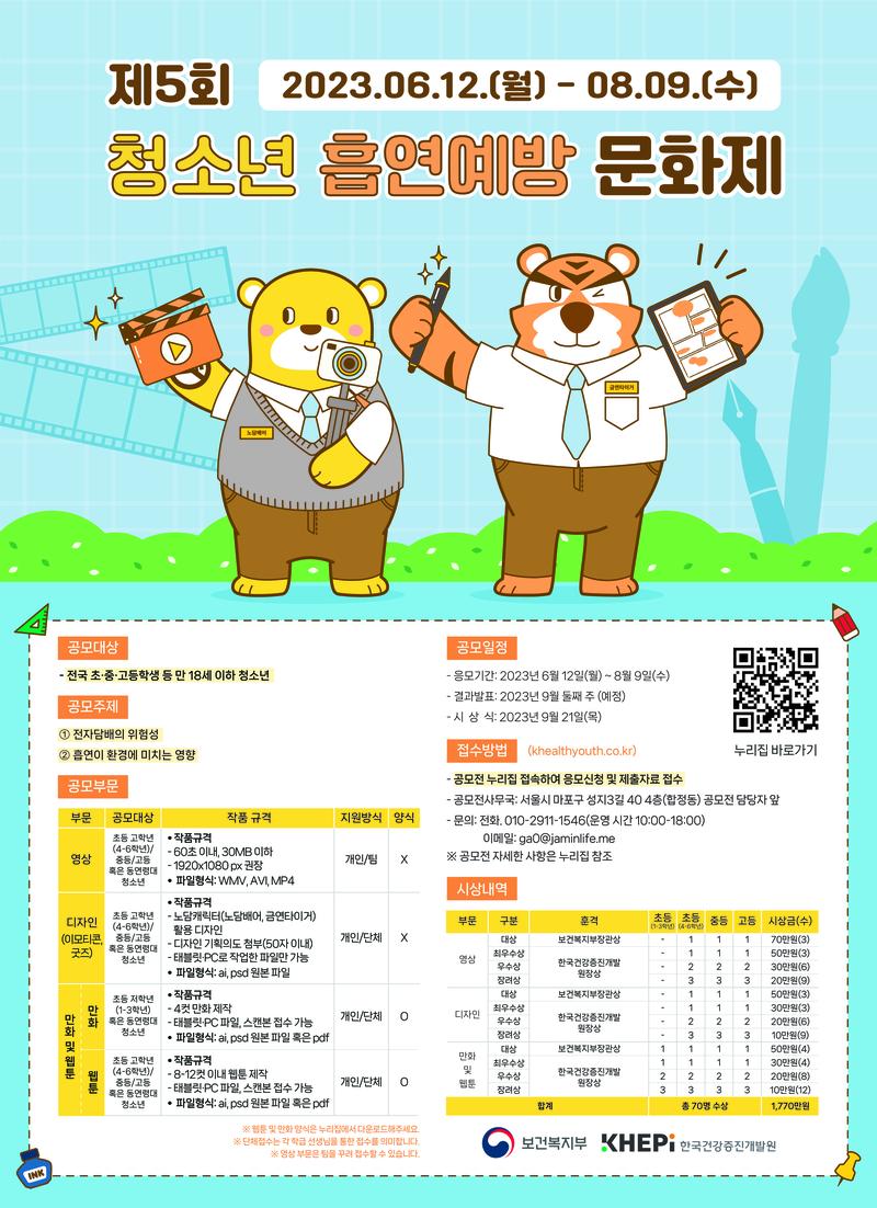 자세한 사항은 제 5회 청소년 흡연예방 문화제 홈페이지를 참조해주세요. 👉 홈페이지 바로가기 https://khealthyouth.co.kr/