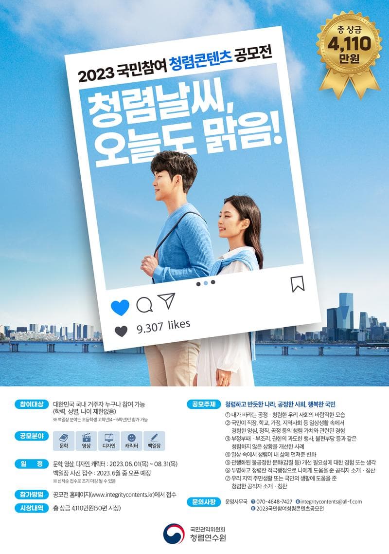 ● 공모 주제 ▶ 청렴하고 반듯한 나라, 공정한 사회, 행복한 국민 - 내가 바라는 공정·청렴한 우리 사회의 바람직한 모습 - 국민이 직장\, 학교\, 가정\, 지역사회 등 일상생활 속에서 경험한 양심\, 정직\, 공정 등의 청렴 가치와 관련된 경험 - 부정부패·부조리\, 권한의 과도한 행사\, 불편부당 등과 같은 청렴하지 않은 상황을 개선한 사례 - 일상 속에서 청렴이 내 삶에 던져준 변화 - 관행화된 불공정한 문화(갑질 등) 개선 필요성에 대한 경험 또는 생각 - 투명하고 청렴한 적극행정으로 나에게 도움을 준 공직자 소개·칭찬 - 우리 지역 주민생활 또는 국민의 생활에 도움을 준 청렴한 공직자 소개·칭찬