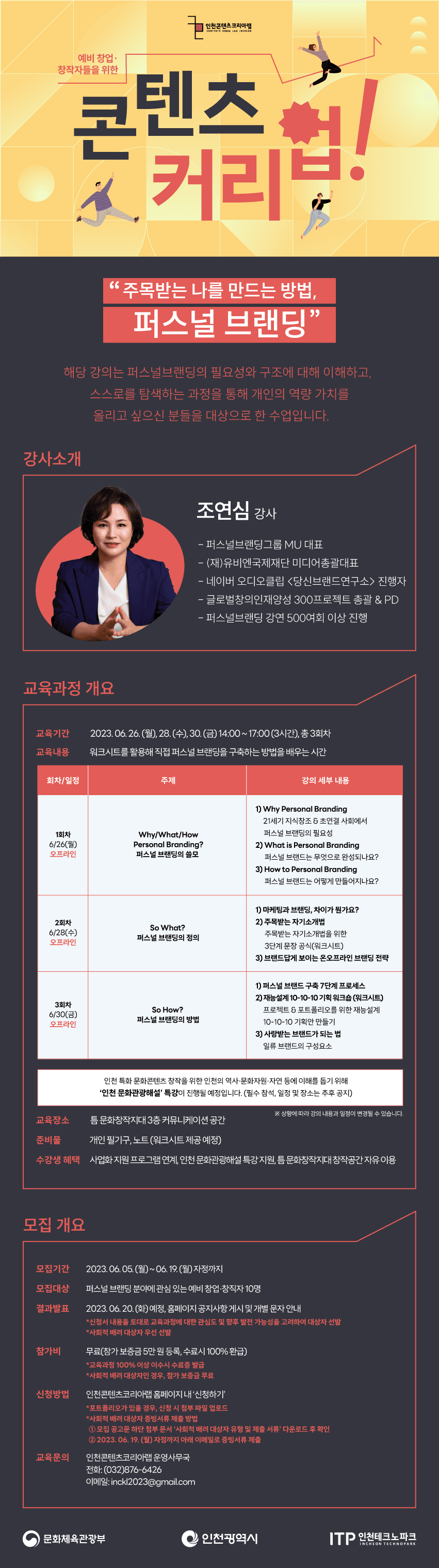 ▶ 교육문의: 인천콘텐츠코리아랩 운영사무국 032-876-6426 / inckl2023@gmail.com