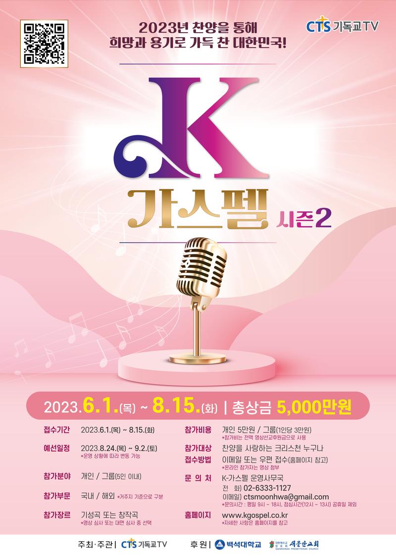 ■ 행 사 명 : K-가스펠 시즌2 ■ 접수기간 : 2023년 6월 1일(목) \~ 8월 15일(화) ■ 예선일정 : 2023년 8월 24일(목) \~ 9월 2일(토) 권역별 지역예선 개최 (수도권, 대전, 대구, 부산, 광주) *운영 상황에 따라 변동 가능 ■ 참가분야 : 개인 / 그룹(5인 이내) ■ 참가부분 : 국내 / 해외(거주지 기준으로 구분) ■ 참가장르 : 기성곡 또는 창작곡 *영상 심사 또는 대면 심사 중 선택 ■ 참가비용 : 개인 50,000원 / 그룹 30,000원 *참가비는 영상 후원금으로 사용 ■ 참가대상 : 찬양을 사랑하는 크리스천 누구나 ■ 참여방법 : 이메일 또는 우편접수 (홈페이지 참조) *온라인 참가자는 영상 첨부 ■ 문 의 처 : 02.6333.1127 / ctsmoonhwa@gmail.com *문의시간 : 평일 9시 \~ 18시 , 점심시간 (12시 \~ 13시)공휴일 제외 ■ 홈페이지 : www.kgospel.co.kr