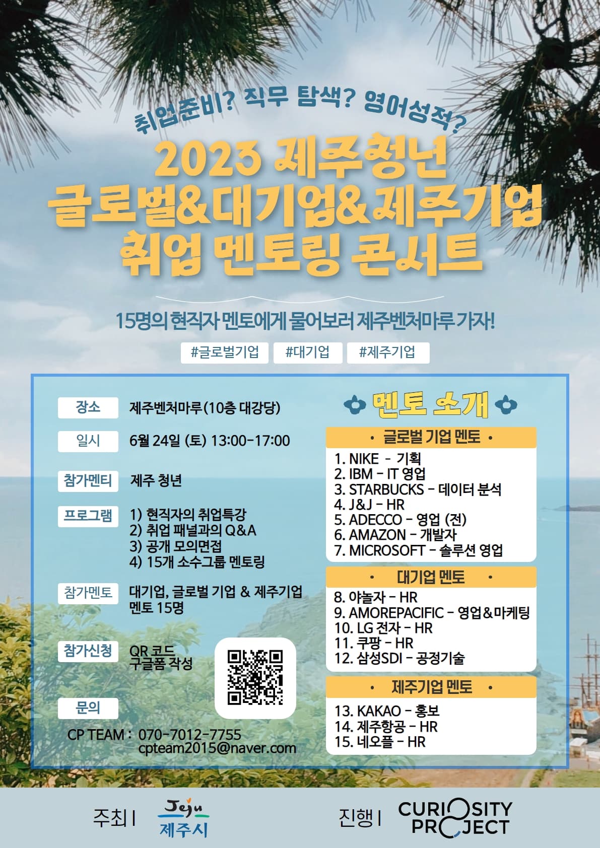 2023 제주청년 글로벌&대기업&제주기업 취업 멘토링 콘서트 ● 장소: 제주벤처마루 10 층 대강당 ● 일시: 6월 24일 (토) 13:00-17:30 ● 참가 멘티 : 제주 청년 ● 프로그램: 1) 현직자 취업특강 2) 취업 패널과의 Q&A 3) 공개 모의면접 4) 15개 소수그룹 멘토링 ● 참가 멘토: 대기업, 글로벌 기업& 제주기업 멘토 15 명 ※글로벌 기업 멘토 1. NIKE – 기획 2. IBM – IT 영업 3. STARBUCKS – 데이터 분석 4. J&J - HR 5. ADECCO – 영업(전) 6. AMAZON- 개발자 7. MICROSOFT – 솔루션 영업