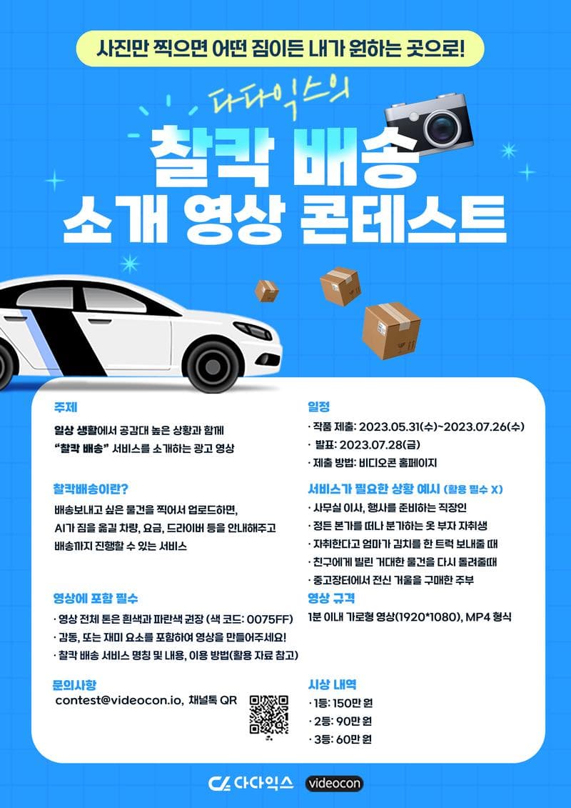주제: 일상생활에서공감대 높은 상황과 함께 “찰칵 배송”서비스를 소개하는 광고 영상 ※찰칵배송이란? 배송 보내고 싶은 물건을 찍어서 업로드하면, AI가 짐을 옮길 차량, 요금, 드라이버 등을 안내해주고 배송까지 진행할 수 있는 서비스 서비스가 필요한 상황 예시(활용 필수 X) - 사무실 이사, 행사를 준비하는 직장인 - 정든 본가를 떠나 분가하는 옷 부자 자취생 - 자취한다고 엄마가 김치를 한 트럭 보내줄 때 - 친구에게 빌린 거대한 물건을 다시 돌려줄 때 - 중고장터에서 전신 거울을 구매한 주부 영상에 포함 필수 - 영상 전체 톤은 흰색과 파란색 권장(색 코드: 0075FF) - 감동, 또는 재미 요소를 포함하여 영상을 만들어 주세요! - 영상 제작 시 차량은 승용차, SUV만 사용해 주세요! - 찰칵 배송 서비스 명칭 및 내용, 이용 방법(활용 자료 참고) 일정 - 작품 제출: 2023.05.31(수)\~2023.07.26(수) - 발표: 2023.07.28(금) - 제출 방법: 비디오콘 홈페이지 영상 규격 - 1분 이내 가로형 영상(1920*1080), MP4 형식 영상 형태 - 모션그래픽, 실사 등 자유 시상 내역 1등: 150만 원 2등: 90만 원 3등: 60만 원