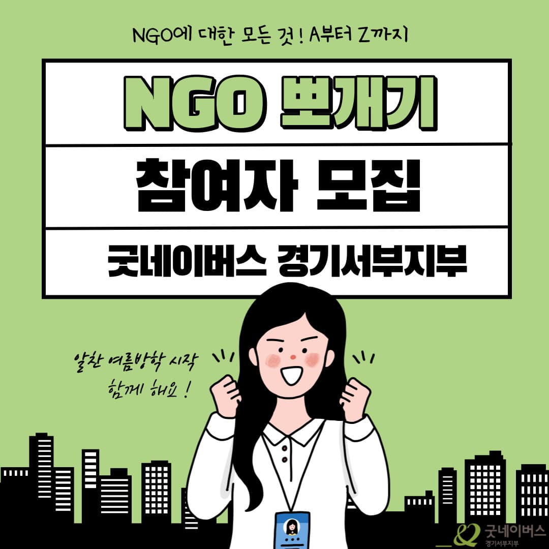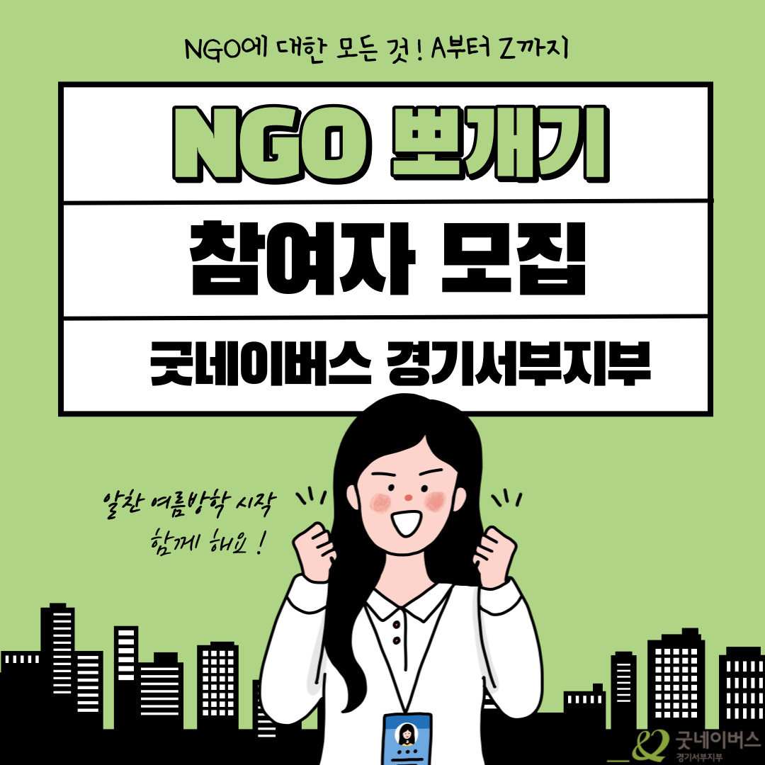안녕하세요. 굿네이버스 경기서부지부입니다 :) 평소 NGO에 대해 궁금하셨던 분들, NGO가 하는 일이 궁금하셨던 분들, NGO 취업을 위한 준비가 막막하게만 느껴지는 분들이 계시다면 여기 집중 !!! 입사 10개월차인 간사님부터 전직 해외 사무장 팀장님, 그리고 입사 15년차 베테랑 지부장님까지 ! 직급별로 다른 이야기를 가지고 있는 NGO 현직 직원들이 한 자리에 모여 현장에서 업무를 하며 겪었던 생생한 경험들, NGO 취업 포인트들을 전하는 라이브한 강의가 진행됩니다 !
