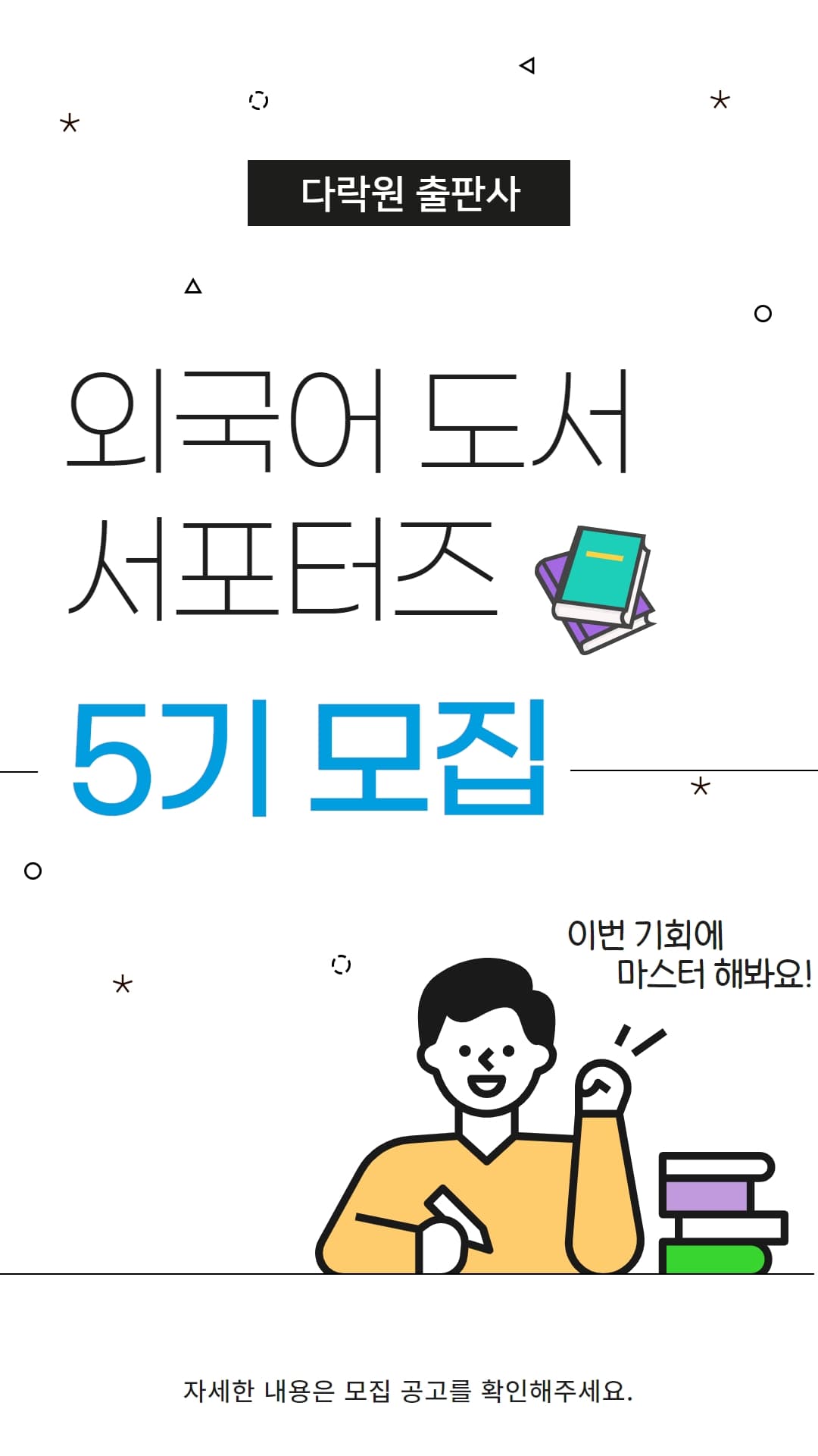 ✅ 다락원 외국어 도서 서포터즈는? 다락원 출판사에서 출간된 교재 중 베스트셀러 & 신간 을 직접 만나보고 매월 완북을 목적으로 공부하며 리뷰를 남기는 활동을 말합니다. ✅서포터즈 혜택은? 1. 다락원 출판사 교재 무료 제공 (매월 1권씩\, 총3권) 2. 원하는 분야 외국어와 도서로 공부 3. 리뷰 마감일까지 완북 목표로 달리기 가능 4. 3개월간 활동 완료후에 추가 선물 지급 네이버 3만원 페이 구폰 + 도서 2권 추가증정 ✅ 서포터즈 지원자격은? 네이버 블로그, 온라인 SNS활동 등 활발히 소통하고 있는 외국어 공부에 관심이 많은 대학생 또는 성인 ✅ 서포터즈 리뷰 방법은? ✔️블로그 리뷰 : 활동계획서 1회, 주차별 후기 4회 ✔️온라인 서점 리뷰 (2회) ✔️커뮤니티 (2회) 또는 SNS 리뷰 (1회) 전 기수 활동 내용 보기> ✅ 서포터즈 응모 방법은? 아래 링크를 통해 접수기간안에 등록하면 응모완료됩니다. https://forms.gle/srDRkY3h1edbMe9Y6 ✅ 서포터즈 선정 발표 다락원 공식 카페를 통해 공지됩니다. https://cafe.naver.com/darakwonbook ✅ 응모시 유의사항 ▪️ 모든 항목을 입력해주셔야 정상 응모됨을 알려드립니다. ▪️ 응모시 선택한 외국어 분야는 선택 불가하니 신중히 선택해주세요. (영/일/중) ▪️ 응모한 정보가 본인 계정이 아닐 시엔 서포터즈 활동이 취소될 수 있습니다. ▪️ 부정확한 정보로 인한 당첨자 확인 및 상품 누락 등은 책임지지 않습니다. ▪️ 본 정보는 서포터즈 지원 및 운영을 위한 정보 취합으로 서포터즈 탈락시 정보 삭제됩니다. ▪️ 신청서 작성시 개인정보 사용을 동의한것으로 간주됩니다. ✅ 서포터즈 활동 유의사항 ▪️ 모든 서포터즈 활동의 공지 및 과제 제출은 다락원 공식 카페를 통해 이뤄집니다. ▪️ 매월 도서 신청을 받으며, 신청 기간내에 반드시 신청해주셔야 합니다. ➔리뷰 완료자에 한해 다음 도서 발송 ▪️ 매월 선택한 도서에 대한 리뷰 마감 기간이 주어지며, 리뷰 미작성자는 개별 문자 및 공지합니다. ▪️ 공지 이후에도 과제 제출하지 않으면, 새책으로 도서 직접 반납하셔야 하며 서포터즈 활동이 취소됩니다.