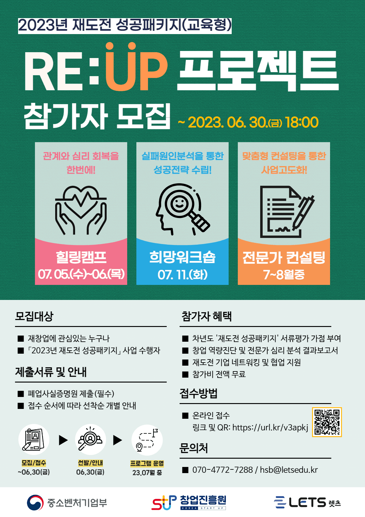 RE:UP 프로젝트는 창업진흥원이 주관하는 『재도전 성공패키지(교육형)』 프로그램으로, 2022년 최우수평가(S등급)를 받은 재창업자 맞춤형 교육 프로그램입니다. 지난 3년간 수많은 (예비)재창업자의 성공적인 심리회복과 재창업 역량 향상 실적을 보유한 ㈜렛츠가 『2023년 재도전 성공패키지(교육형)』 RE:UP 프로젝트 참가자를 모집합니다!
