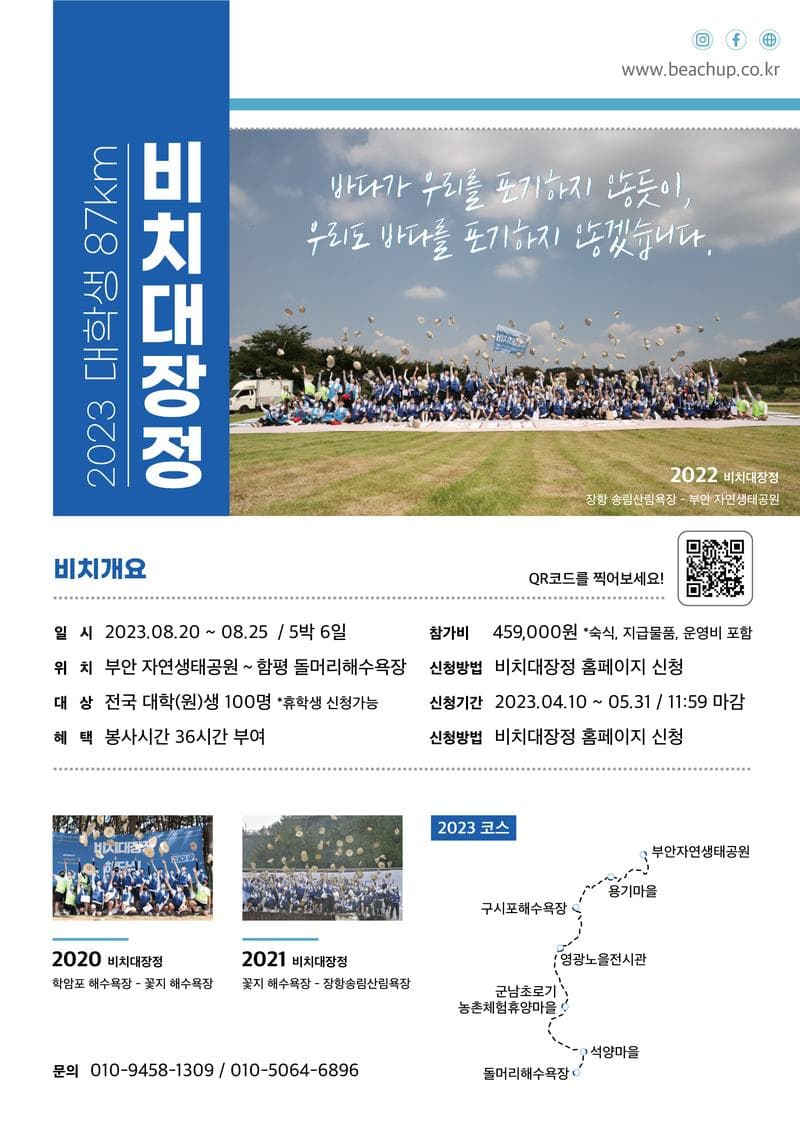 ‘2023 대학생 87km 비치대장정’ 대원 2차 모집(\~06.16) 비진학 청년 및 취준생 참가문의가 많아 모집대상을 늘려서 2차 모집을 진행합니다 :) 📌활동 기간 8월 20일(일) – 25일(금) / 5박 6일 📌활동 장소 부안 - 고창 - 영광 - 함평(87km) 📌2차 모집 기간 6월 5일(월) - 16일(금) / 2주간 📌모집 대상 - 전국 대학생 재(휴)학생 10명 - 외국인 유학생 및 교환학생 10명 - 만 19세 이상 34세 이하 취업준비생 10명 📌참가비 459,000원 *숙식, 지급물품, 운영비 포함 / 분할 납부가능. 📌참가신청 방법 지원페이지 링크에서 참가신청서 다운로드받아 작성 후 이메일 제출 ✨참가자 전원에게 87km 완주증서, 봉사시간 36시간, 숙식, 활동물품, 단체복 및 뱃지 등을 제공해드립니다🤗