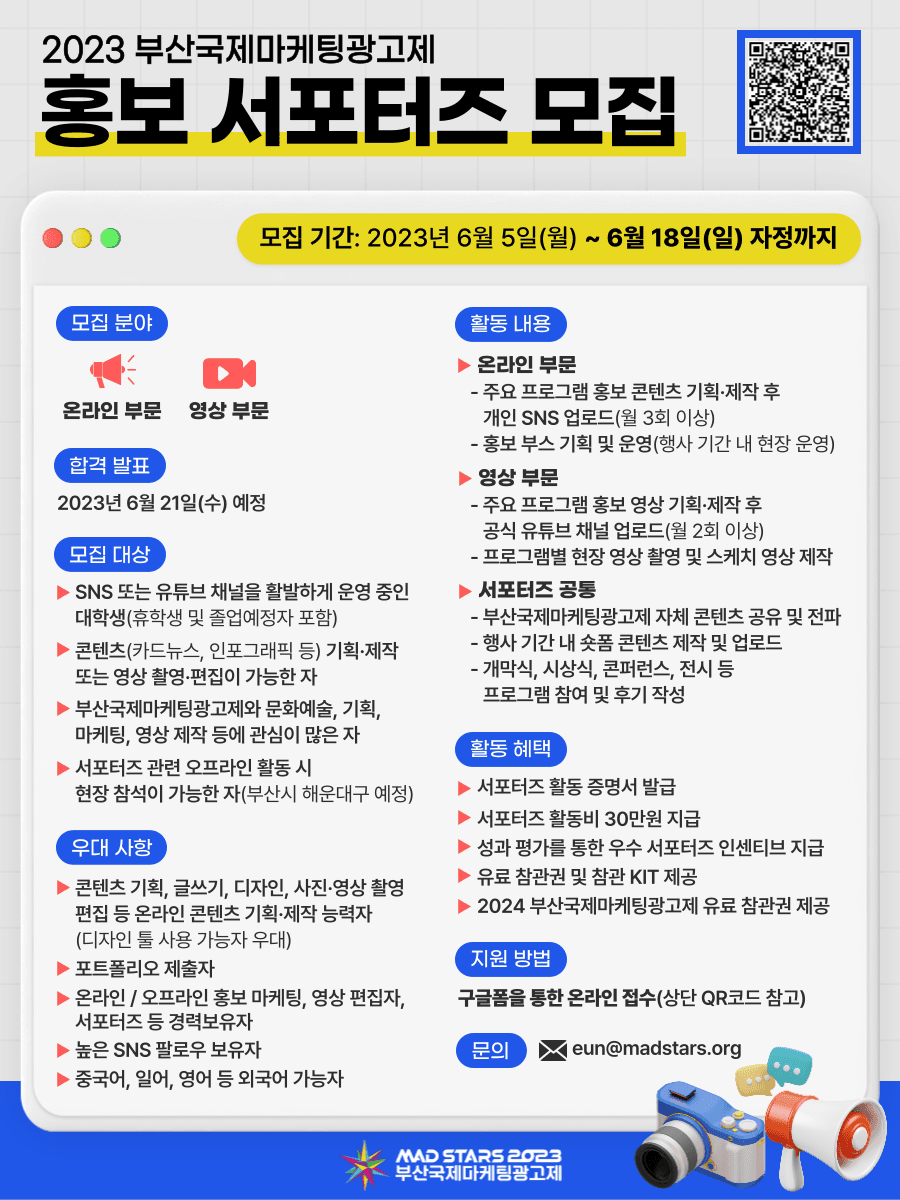 ❍ 모집 개요 ▷ 모집일정: 2023. 6. 5.(월) \~ 6. 18.(일) 자정까지 ▷ 합격발표: 2023. 6. 21.(수) 예정 / 홈페이지 및 온라인채널 발표 ▷ 활동기간: 위촉일로부터 \~ 9월 / 3개월 ▷ 모집인원: 0명(온라인 / 영상 부문) ❍ 모집 대상 ▷ SNS(인스타그램·블로그·페이스북) 또는 유튜브 채널을 활발하게 운영 중인 대학생(휴학생 및 졸업예정자 포함) ▷ 콘텐츠(카드뉴스, 인포그래픽 등) 기획·제작 또는 영상 촬영·편집이 가능한 자 ▷ 부산국제마케팅광고제와 문화예술, 기획, 마케팅, 영상 제작 등에 관심이 많은 자 ▷ 서포터즈 관련 오프라인 활동 시 현장 참석이 가능한 자(8.21.\~8.25. / 부산시 해운대구 예정) ❍ 우대 사항 ▷ 콘텐츠 기획, 글쓰기, 디자인, 사진·영상 촬영 편집 등 온라인 콘텐츠 기획·제작 능력자(포토샵, 일러스트레이터 등 디자인 툴 사용 가능자 우대) ▷ 포트폴리오 제출자 ▷ 온라인 / 오프라인 홍보 마케팅, 영상 편집자, 서포터즈 등 경력보유자 ▷ 높은 SNS 팔로우 보유자 ▷ 중국어, 일어, 영어 등 외국어 가능자 ❍ 활동 내용 ▷ 온라인 부문 - 주요 프로그램 홍보 콘텐츠 기획·제작 후 개인 SNS 업로드(월 3회 이상) - 홍보 부스 기획 및 운영(행사 기간 내 현장 운영) ▷ 영상 부문 - 주요 프로그램 홍보 영상 기획·제작 후 공식 유튜브 채널 업로드(월 2회 이상) - 프로그램별 현장 영상 촬영 및 스케치 영상 제작 ▷ 서포터즈 공통 - 부산국제마케팅광고제 자체 콘텐츠 공유 및 전파(수시) - 행사 기간 내 숏폼 콘텐츠 제작 및 업로드(2건 이상) - 개막식\, 시상식\, 콘퍼런스\, 전시 등 프로그램 참여 및 후기 작성 ❍ 활동 혜택 ▷ 서포터즈 활동 증명서 발급 ▷ 서포터즈 활동비 30만원 지급(활동 종료 후 일괄 지급 예정) ▷ 성과 평가를 통한 우수 서포터즈 인센티브 지급 ▷ 유료 참관권 및 참관 KIT 제공 ▷ 2024 부산국제마케팅광고제 유료 참관권 제공 ❍ 지원 방법 ▷ 온라인 접수(홍보 서포터즈 지원서 바로가기) ❍ 유의사항 ▷ 최종 합격자 제출 서류 중 허위사실 발견 시 합격 취소 ▷ 활동 실적 저조 또는 불성실 사례 발생 시 혜택 제공 중단(상호 간 협의) ▷ 활동기간 내 유사한 축제·행사 관련 서포터즈 활동 지양 ▷ 상기 모든 내용은 조직위원회의 사정에 따라 변경될 수 있음 ❍ 문의 : 부산국제마케팅광고제 홍보 서포터즈 담당자(eun@madstars.org)