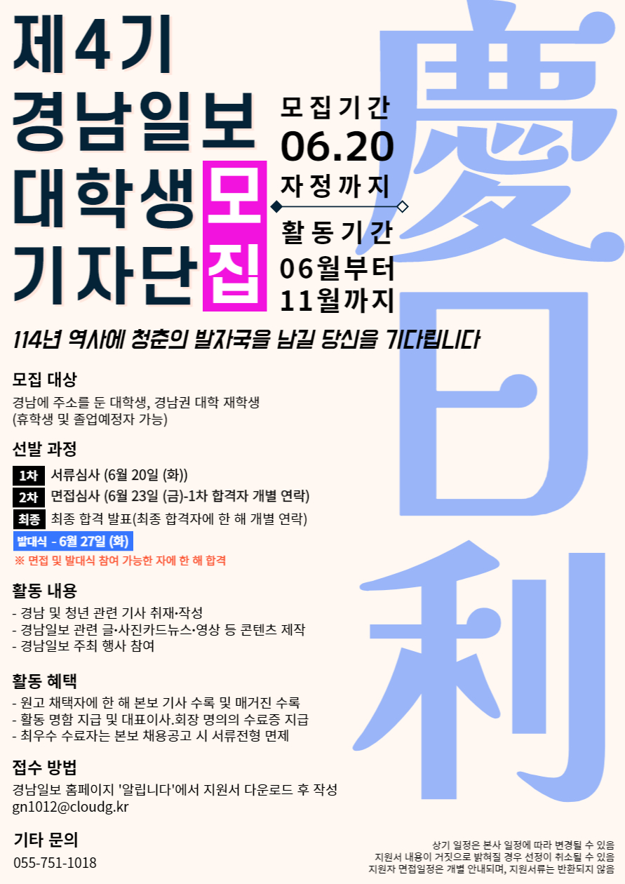 창간 114주년을 맞이한 경남일보에서 <제4기 경남일보 대학생 기자단>을 모집합니다. 언론, 취재, 기획, 사진, 영상 등 다양한 분야에서 재능을 빛낼 수 있는 기회의 장입니다. 청춘의 싱그러움과 새뜻한 아이디어로 특별한 경험에 도전할 대학생 여러분들의 많은 지원 바랍니다.