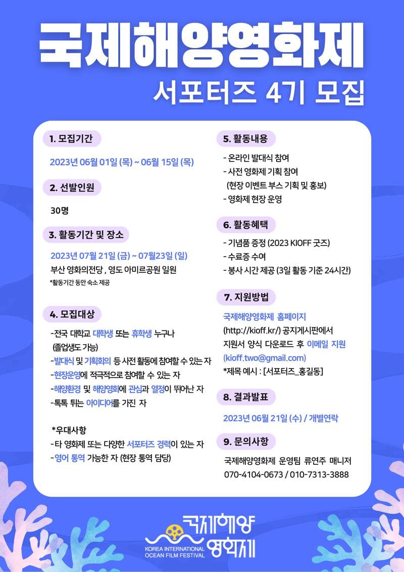 ✅지원방법 국제해양영화제 홈페이지 (https://kioff.kr/)) 공지게시판에서 지원서 양식 다운로드 후 이메일 지원 (kioff.two@gmail.com) *제목 예시 : [서포터즈_홍길동]