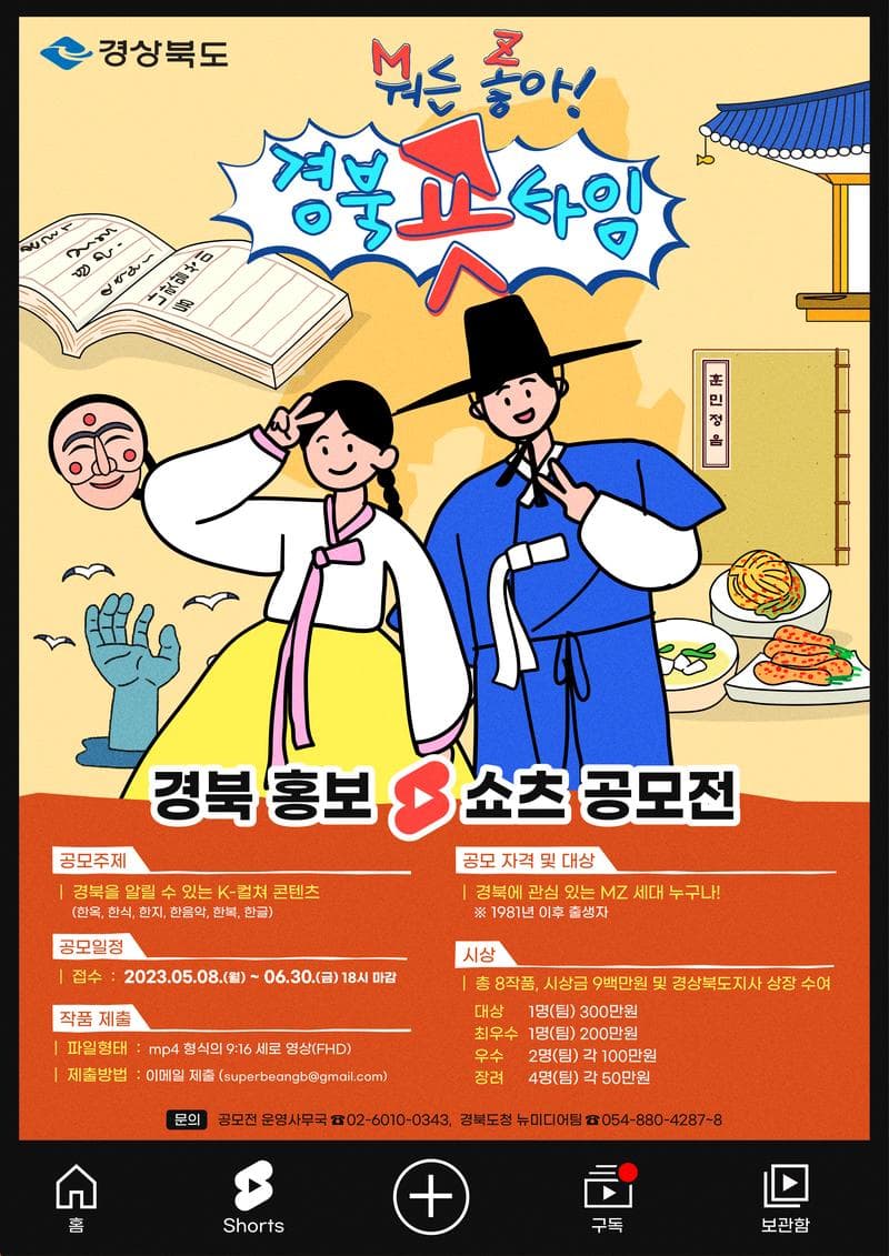 뭐든 좋아! ’경북 숏타임‘ ■ 접수기간 : 2023년 5월 8일 (월) \~ 6월 30일 (금) (6월 30일 18:00까지 접수) ■ 참가대상 : 경북에 관심 있는 MZ세대 누구나(개인 또는 팀) ※1981년 이후 출생자 ■ 공모주제 : 경북을 알릴 수 있는 K-컬쳐 콘텐츠 - 경북과 관련된 한옥, 한식, 한복, 한글, 한지, 한음악 홍보 영상 ■ 공모분야 : 유튜브 쇼츠 영상(60초 이내) / 광고, 예능, 먹방 등 장르불문 ■ 총 상금 : 9백만원 지급(총 8개 작품) ■ 작품 형식 ① (파일형태) mp4 동영상 파일 ② (해 상 도) Full-HD 이상급 화질의 9:16 세로 영상(1080*1920) ③ (영상길이) 30초 \~ 60초 이내 ■ 제출서류 : 출품작 파일 및 붙임 서식 - 참가 신청서, 개인정보 수집 및 이용 동의서, 참가 서약서 - 팀별 접수일 경우 창작자 전원의 참가서약서를 작성(개인별 1장, 자필서명 후 PDF파일 제출) ※경상북도 홈페이지 ‘고시공고’(https://bit.ly/3M26s7Y)란에서 서식을 다운로드해 작성 후 압축 후(zip) 이메일 제출 ※이메일 접수 시 [경북숏타임_작품명_이름(대표자 또는 팀명)]으로 표기 ■ 심사기준 : 총 배점 100점 [작품의 완성도 및 활용성] 30점 [주제(경북 홍보)와의 적합성] 30점 [독창성 및 예술성] 20점 [스토리의 완결성 및 구성력] 20점 ■ 시상내역 : 총 8작품, 시상금 9백만원 및 경상북도지사 상장 수여 [대상] 300만원 (1편) [최우수] 200만원 (1편) [우수] 100만원 (2편) [장려] 50만원 (4편) ※ 작품 접수 건수 및 심사결과에 따라 당선작 전부 또는 일부를 선정하지 않을 수 있음 ■ 유의사항 ◦ 개인 또는 팀별(최대 3인) 1작품만 출품 가능하며, 모든 작품은 공고 기간 이내에 제작한 순수 창작물이어야 함 ◦ 출품작의 일정 기준에 부합되지 않을 때는 상금 및 작품 수가 변경될 수 있음 ◦ 영상물에는 저작권에 문제가 없는 음원을 사용해야 하며, 반드시 음원 제목과 출처를 명시해야 함 ◦ 타인의 명예를 훼손하거나 불법 정보 유포, 저작권 및 초상권 침해 또는 제작 과정 등에서 발생하는 모든 문제에 대한 법적 책임은 응모자 본인에게 있음. ◦ 출품작이 다음 사항 해당 시 접수 취소·심사 제외되며, 입상 이후 이와 같은 문제가 밝혀질 경우 수상 취소 및 상금 환수 조치함. - 단순한 주의 환기·진정·비판·건의이거나 불만의 표시에 불과한 것 - 선정적이거나 욕설 등 비윤리적이거나 비교육적인 작품인 경우 - 공모전 목적에 부합되지 않거나 주제와 전혀 관련된 사항이 아닌 것 - 타 국내외 공모전 및 유사 지원 사업의 수상작인 경우 - 지적재산권을 침해하거나 표절, 무단 도용 등 저작권 관련 문제가 있는 작품인 경우 ◦ 수상작에 대한 저작권은 수상자에게 있으나 사용권은 경북도에 귀속되며, 수상작을 공공목적의 홍보물로 이용(재가공·복제·배포)하는 경우 이용 대가는 상금으로 대체한 것으로 간주함 ◦ 경북도에서 수상 영상 재가공, 재편집이 필요할 시 수용해야 함 ◦ 상금은 경북도에서 요구하는 서류를 모두 갖춰야 수령 가능하며, 서류 제출 요청 후 1개월 이내 미제출 시 상금 수령 불가함. ◦ 상금에 대한 제세공과금은 수상자 본인이 부담하여야 함. ◦ 그 외 언급하지 않은 사항은 경북도의 결정에 따름 ■ 문의사항 : ☎보이소TV 공모전 운영사무국(02-6010-0343) ☎경북도청 대변인실 뉴미디어팀(054-880-4287\~8)