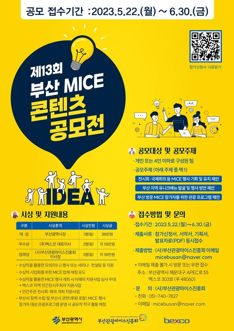 ● 공모내용 1) 전시회·국제회의 등 MICE 행사 기획 및 유치 제안 - 엔데믹 시대 대응 ‘하이브리드 전략’* 등을 활용한 MICE 행사 기획 및 유치 * (하이브리드 마이스) 실제 오프라인 행사 현장과 온라인이 결합된 새로운 형태의 마이스로, 행사 기획, 현장 운영에 VR, ICT 등 다양한 언택트(비대면) 기술이 활용되며 엔데믹시대 새로운 마이스 형태로 새롭게 대두되고 있음 - 부산의 전략산업 분야 및 도시 비전에 맞는 행사 기획 - 기존 MICE 행사를 활용한 연계 및 확대 등 활성화 방안