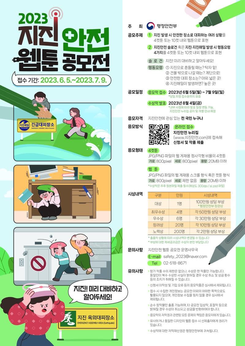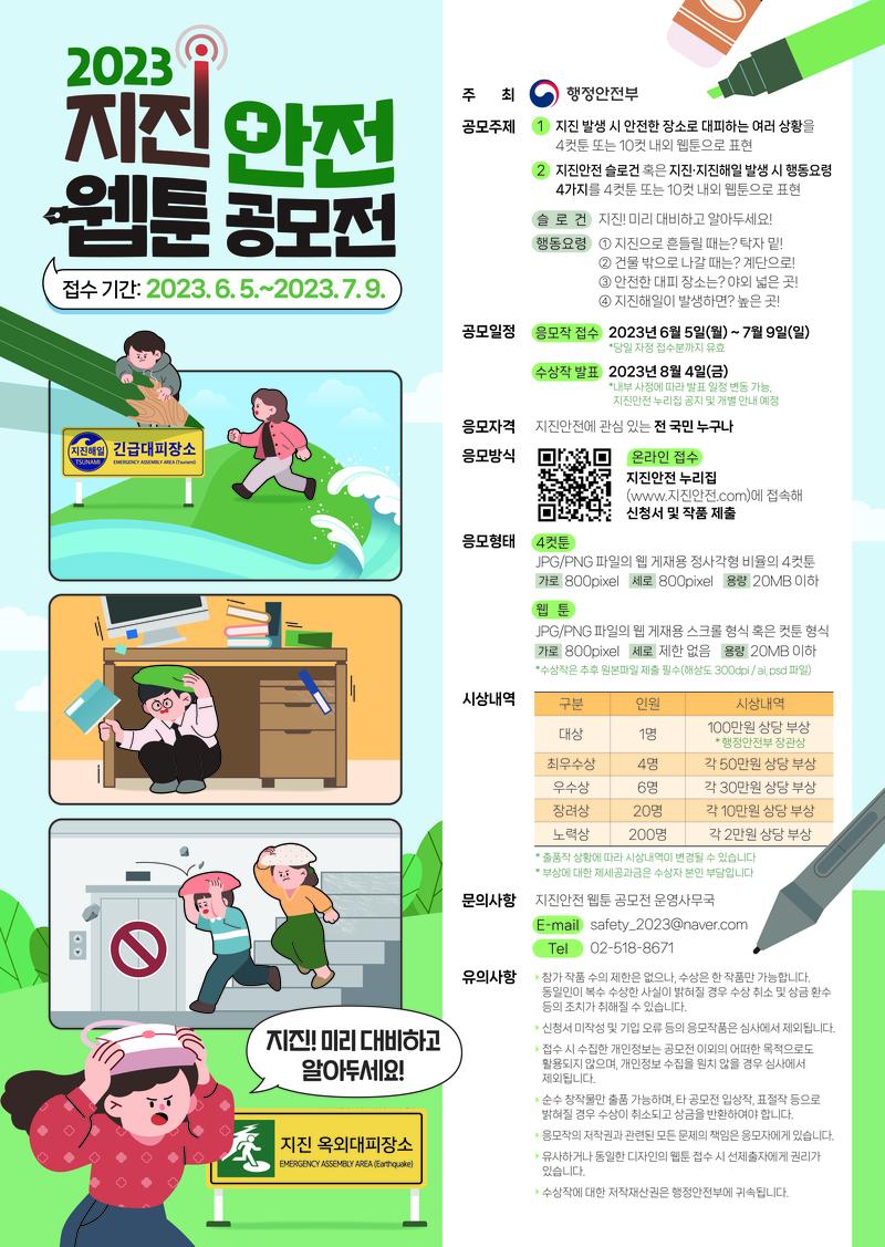 ① 4컷툰의 경우 1)슬로건을 주제로 한 4컷툰 또는 2)지진·지진해일 발생 시 행동요령 4가지 모두를 반영한 4컷툰 ② 웹툰은 1)슬로건을 주제로 한 10컷 내외 웹툰 혹은 2)지진·지진해일 발생 시 행동요령 4가지 중 1개 이상을 포함해 스토리텔링한 10컷 내외 웹툰 ○ 공모전 사이트 링크 - https://www.지진안전.com ○ 응모자격 - 지진안전에 관심 있는 전 국민 누구나! ○ 공모전 마감일 - 2023.07.09 까지! ○ 시상 내역 - [ 대상 ] 1명 \| 행정안전부 장관상\, 100만 원 상당 부상 [ 최우수상 ] 4명 \| 각 50만 원 상당 부상 [ 우수상 ] 6명 \| 각 30만 원 상당 부상 [ 장려상 ] 20명 \| 각 10만 원 상당 부상 [ 노력상 ] 200명 \| 각 2만 원 상당 부상 ○ 응모 일정 - 응모작 접수: 2023년 6월 5일(월) \~ 7월 9일(일) *당일 자정 접수분까지 유효 수상작 발표: 2023년 8월 4일(금) *내부 사정에 따라 발표 일정 변동 가능, 지진안전 누리집 공지 및 개별 안내 예정 ○ 심사기준 및 방법 - 주제와의 적합성, 전달성, 독창성, 완성도를 심사 기준으로 공정한 심사를 진행하며, 심사 진행 방식은 다음과 같습니다. 1) 행정안전부와 웹툰 전문 심사위원의 1차 예선 심사로 2배수 선정 2) 온(ON)국민소통을 통한 국민 투표 진행 3) 국민 투표 결과와 행정안전부·웹툰 전문 심사위원의 2차 심사 결과를 종합하여 최종 수상작 선정 ○ 제출/접수 방법 - 지진안전 누리집(www.지진안전.com)에 접속해 신청서 및 작품 제출 ① 4컷툰: - JPG/PNG 파일의 웹 게재용 정사각형 비율의 4컷툰 - (가로) 800pixel (세로) 800pixel (용량) 20MB 이하 ② 웹툰: - JPG/PNG 파일의 웹 게재용 스크롤 형식 혹은 컷툰 형식 - (가로) 800pixel (세로) 제한 없음 (용량) 20MB 이하 *수상작은 추후 원본파일 제출 필수(해상도 300dpi / ai, psd파일) ○ 유의사항 / 문의사항 - 참가 작품 수의 제한은 없으나\, 수상은 한 작품만 가능합니다. 동일인이 복수 수상한 사실이 밝혀질 경우 수상 취소 및 상금 환수 등의 조치가 취해질 수 있습니다. - 신청서 미작성 및 기입 오류 등의 응모작품은 심사에서 제외됩니다. - 접수 시 수집한 개인정보는 공모전 이외의 어떠한 목적으로도 활용되지 않으며\, 개인정보 수집을 원치 않을 경우 심사에서 제외됩니다. - 순수 창작물만 출품 가능하며\, 타 공모전 입상작\, 표절작 등으로 밝혀질 경우 수상이 취소되고 상금을 반환하여야 합니다. - 응모작의 저작권과 관련된 모든 문제의 책임은 응모자에게 있습니다. - 유사하거나 동일한 디자인의 웹툰 접수 시 선제출자에게 권리가 있습니다. - 수상작에 대한 저작재산권은 행정안전부에 귀속됩니다. 지진안전 웹툰 공모전 운영사무국 Tel. 02-518-8671 E-mail. safety_2023@naver.com