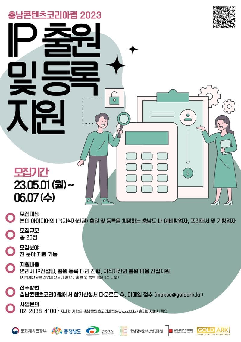 2023 충남콘텐츠코리아랩 콘텐츠 IP 출원 및 등록 지원 참가자 모집공고 ▶모집개요 접수기간 : 2023년 5월 1일(월) \~ 6월 9일(금) 신청자격 : IP(지식재산권) 출원 및 등록을 희망하는 충남도 내 예비창업자, 프리랜서 및 기창업자 모집규모 : 총 20팀 모집분야 : 전 분야 지원 가능 ▶지원내용 및 혜택 지원내용 : 변리사 IP 컨설팅, 출원 및 등록 대리 진행 지원혜택 : 지식재산권 출원 비용 간접지원 ※ 지식재산권은 산업재산권에 한하며, 출원 및 등록 팀별 1건 내외 지원 ▶지원방법 충남콘텐츠코리아랩 홈페이지(링크)에서 참가신청서 다운로드 후 이메일 접수(moksc@goldark.kr) ▶사업문의 문의 : 02-2038-4100 / moksc@goldark.kr