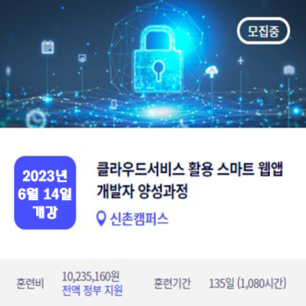 [더조은아카데미 - 신촌캠퍼스] 훈련과정 - [K-Digital] 클라우드 기반 자바 웹 & 앱 개발자 양성과정 교육일정 - 2023년 06월 14일 \~ 2023년 12월 27일 교육시간 - 09:30 \~ 18:30 (주5일 수업 / 일일 8시간) 교육비용 - 전액국비지원 교육문의 - 02-703-7025 / ocm7607@naver.com