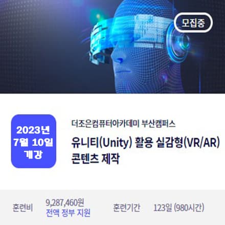 [더조은아카데미 - 부산캠퍼스] 훈련과정 - [K-Digital] 유니티(Unity) 활용 실감형(VR / AR)콘텐츠 제작 과정 교육일정 - 2023년 07월 10일 \~ 2024년 01월 05일 교육시간 - 09:30 \~ 18:30 (주5일 수업 / 일일 8시간) 교육비용 - 전액국비지원 교육문의 - (통합) 02-703-7025 / ocm7607@naver.com