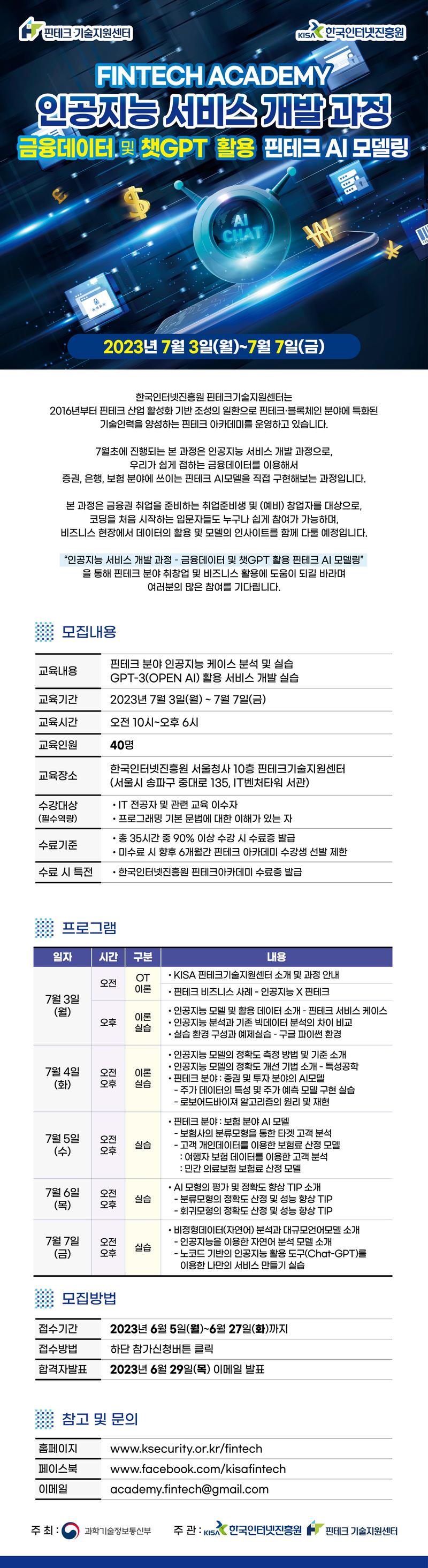 7월초에 진행되는 본 과정은 인공지능 서비스 개발 과정으로, 우리가 쉽게 접하는 금융데이터를 이용해서 증권, 은행, 보험 분야에 쓰이는 핀테크 AI모델을 직접 구현해보는 과정입니다.