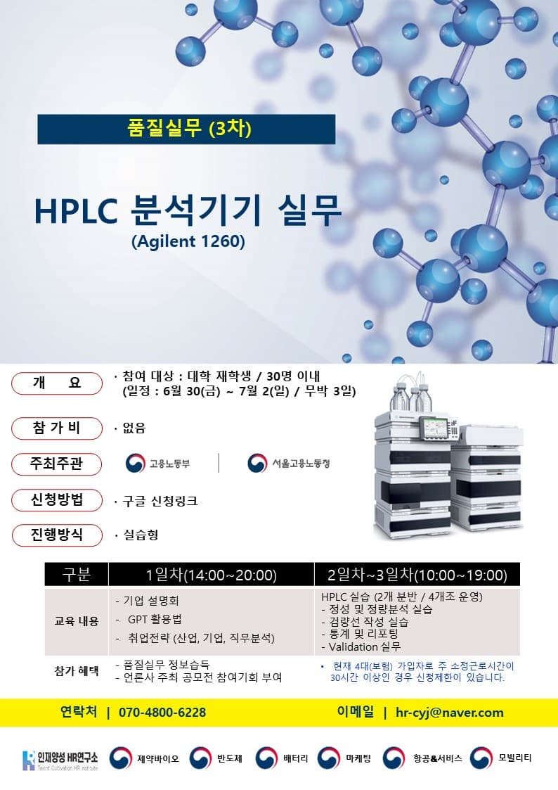 ■ 교육 과정 : 2023 품질실무 특화과정 프로그램(HPLC 실습 포함) ■ 주최/주관 : 고용노동부/서울고용노동청 ■ 모집 대상 : 서울(수도권) 대학 재학생(졸업생은 참여하실 수 없습니다.) *30명 선착순 마감. ■ 수강 비용 : 무료 ■ 교육 일정 : 6월 30일(금) \~ 7월 2일(일) / 무박 3일 - 1일차 : 14:00\~20:00 (OT\, 기업설명회\, GPT 활용법\, 취업전략(산업\,기업\,직무분석) - 2\~3일차 : 10:00 \~ 19:00 (분반 운영\, HPLC 실습 : 정성 및 정량분석 실습\, 밸리데이션 실무 등) * 세부 내용 홍보포스터 참조(첨부 이미지 / 과정 신청 페이지에서도 확인 가능) ■ 탐방 기업 : 관련 기업 (강서구 소재) ■ 진행 방법: 온라인 실시간 ZOOM 및 HPLC 실습 (서울시 중구 정동길3, 경향신문사빌딩 16층) ■ 신청 방법: 구글 설문지 폼으로 신청 (https://forms.gle/b9mxuqmcueWqKyo78) ※ 유의사항 (필독) : - 반드시 6/30(금)\~7/2(일) 3일간 수강 가능한 대상자만 신청바랍니다. - 직장인(4대보험 가입자)로 주 소정 근로시간이 30시간 이상인 경우 신청이 제한 됩니다. - 교육기간 중 파트타임(알바) 근무를 병행하실 분들은 절대로 신청하시면 안됩니다. - 외국인 유학생은 참가 대상에서 제외됩니다.**