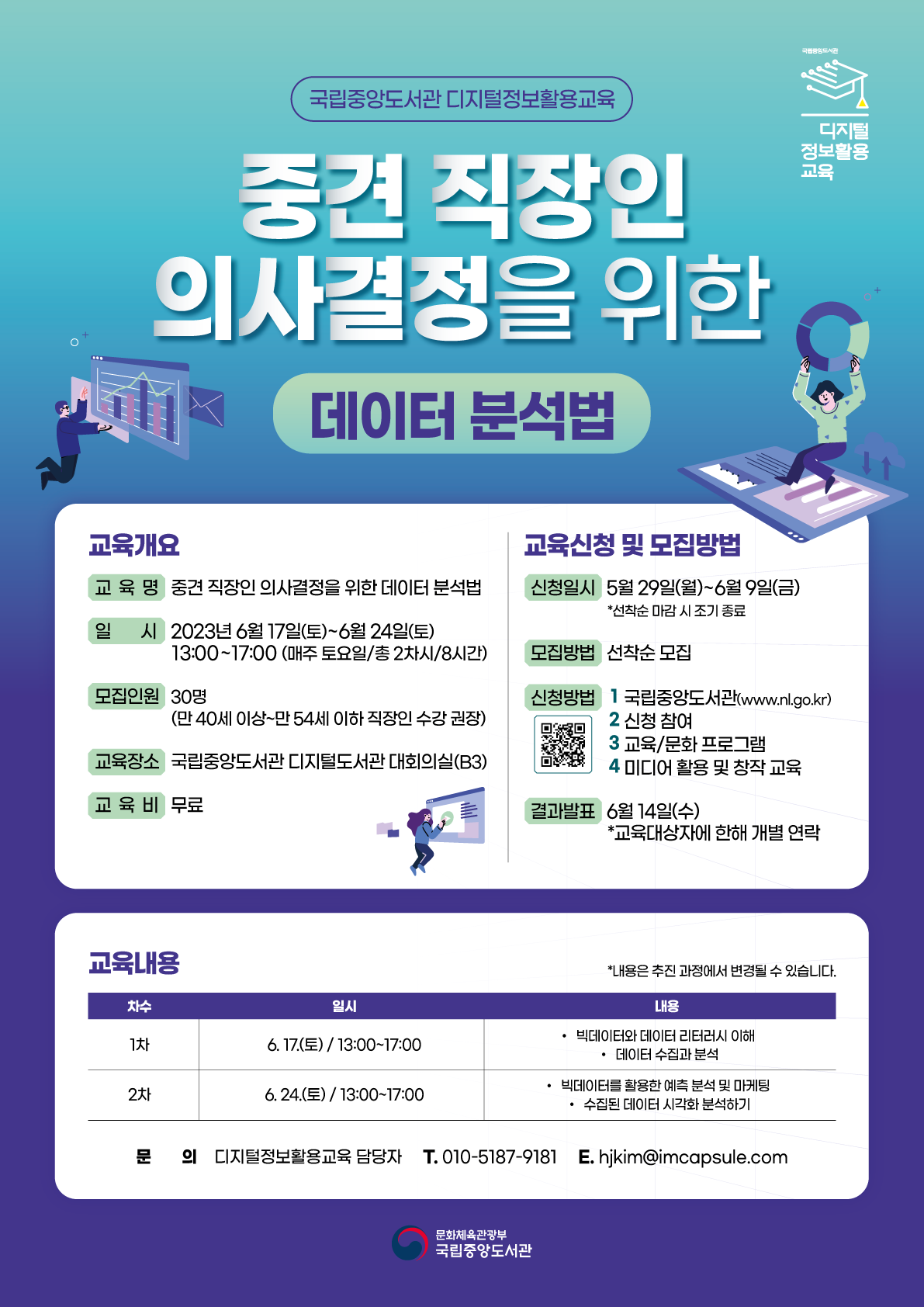 국립중앙도서관에서는 중견 직장인의 디지털 리터러시 역량 강화를 위해 「중견 직장인 의사결정을 위한 데이터 분석법」 교육을 운영합니다. 비즈니스 데이터를 효과적으로 분석하여 직장 내 합리적인 의사결정에 활용하고자 하는 직장인 분들의 많은 관심과 지원 바랍니다.