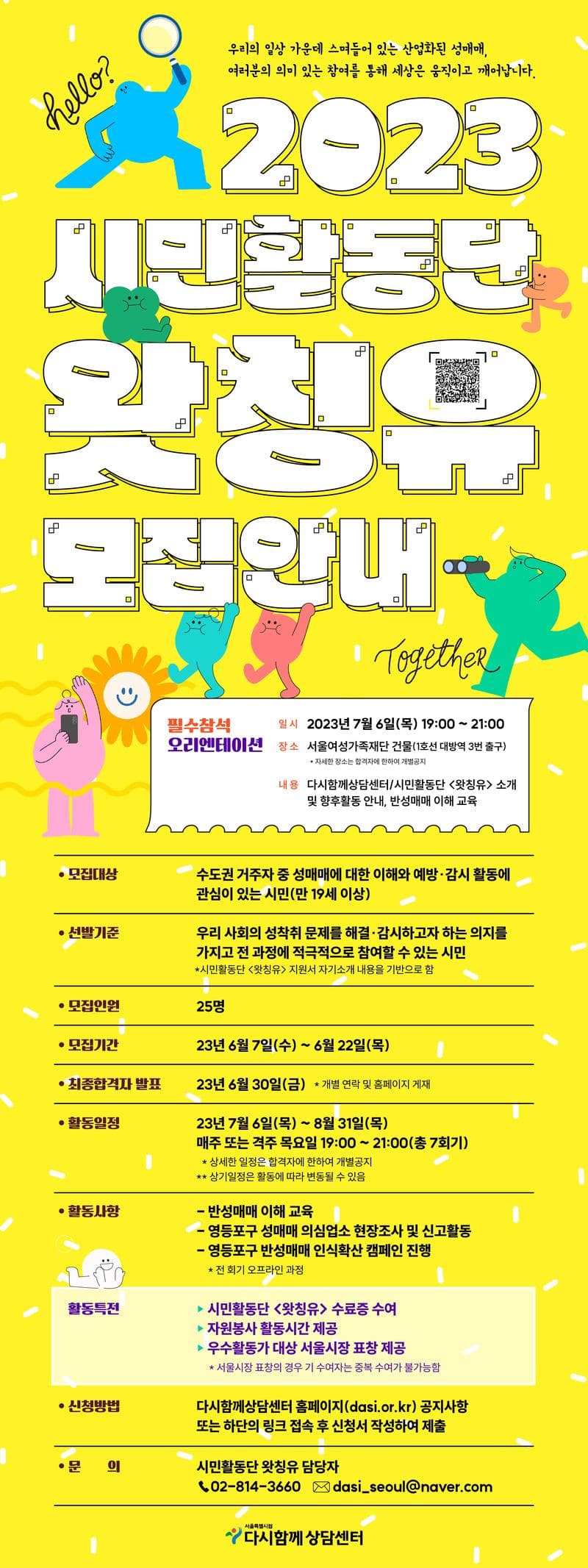 다시함께상담센터에서 반성매매 실천을 함께할 시민을 찾습니다 ! ‣ 모집대상: 수도권 거주자 중 성매매에 대한 이해와 예방·감시 활동에 관심이 있는 시민 (만 19세 이상) ‣ 선발기준 : 우리 사회의 성착취 문제를 해결·감시하고자 하는 의지를 가지고 전 과정에 적극적으로 참여할 수 있는 시민 *시민활동단 <왓칭유> 지원서 자기소개 내용을 기반으로 함 ‣ 활동사항 : - 반성매매 이해 교육 - 영등포구 성매매 의심업소 현장조사 및 신고활동 - 영등포구 반성매매 인식확산 캠페인 진행 *전 회기 오프라인 진행 ‣ 모집인원 : 25명 ‣ 활동특전 - 시민활동단 <왓칭유> 수료증 수여 - 자원봉사 활동시간 제공 - 우수활동가 선발 및 서울시장 표창 제공 * 서울시장 표창의 경우 기 수여자는 중복 수여가 불가능함 ‣ 모집기간 : 6/7(수)-6/22(목) ‣ 합격자 발표 : 6/30(금) *개별 연락 및 홈페이지 게재 ‣ 활동일정 : 7/6(목)\~8/31일(목) 매주 또는 격주 목요일, 19:00-21:00 (총 7회기) *상세한 일정은 합격자에 한하여 개별공지 **상기일정은 상황에 따라 변동될 수 있음 ‣ 필수참석 오리엔테이션 - 일시 : 2023년 7월 6일(목), 19:00-21:00 - 장소 : 서울여성가족재단 건물(1호선 대방역 3번 출구) - 내용 : 다시함께상담센터/시민활동단 왓칭유 소개 및 향후 활동 안내, 반성매매 이해 교육 등 *자세한 장소는 합격자에 한하여 개별공지 ‣ 신청링크 :https://forms.gle/pccp1kVu8A38enpe9 ‣ 문의 : 시민활동단 왓칭유 담당자 02-814-3660, dasi_seoul@naver.com 다시함께상담센터와 함께 반성매매 실천으로 세상을 움직이고 깨어나게 할 많은 분들의 참여를 기다립니다:)