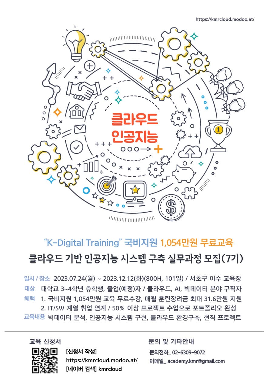 [교육개요] 1. 교육명 : 클라우드 기반 인공지능 시스템 구축실무과정 7기 2. 교육대상 : IT/SW 개발자 취업을 희망하는 대학교 3\~4학년\, 졸업(예정)자\, 취업/이직준비생 등 / 정원 24명 3. 교육기간 : 2023년 07월 24일(월) \~ 2023년 12월 12일(화) / 101일 800시간 / 09\~18시\, 1일 8시간 4. 교육장소 : 서울시 서초구 동작대로 132, 안석빌딩 9층 904호 5. 교육비 : 전액 무료(국고지원) / 1인 교육비용 1,054만원 상당(내일배움카드 발급 필수) 6. 모집기간 : 고용노동부 전산 등록으로 인한 마감기한 엄수 - 7기 : 2023년 07월 03일(월)\~ 2023년 07월 28일(금) ※ 국민내일배움카드 발급이 2주가 걸리므로 반드시 교육시작 최소 2주전 신청요망 7. 참여자 혜택 ① 수업의 50% 이상을 반영하여 현업에 적용할 프로젝트 활동 실시 ⇒ 기업/시장분석, 역량강화 ② 현직 SW 기술전문가의 프로젝트 참여 멘토링 진행 ③ 본 프로그램 수료생 대상 채용 우대 기업으로의 연계지원 ④ 취업을 위한 진로/취업상담 멘토링 제공 ⑤ 매월 훈련장려금 최대 31.6만원 지급