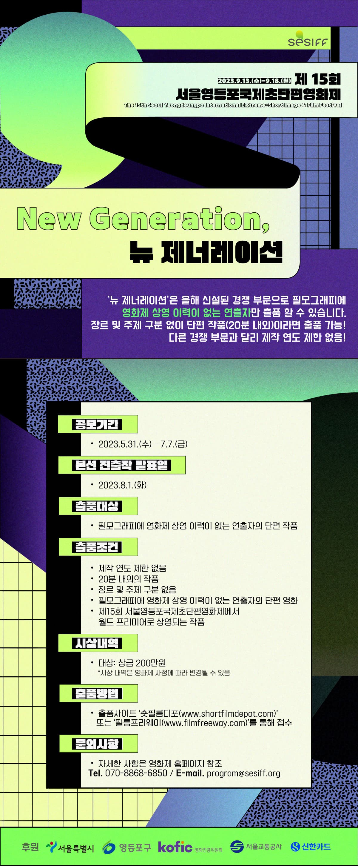 ○ 출품대상 - 필모그래피에 영화제 상영 이력이 없는 연출자의 단편 작품 ○ 출품조건 - 제작 연도 제한 없음 - 20분 내외의 작품 - 장르 및 주제 구분 없음 - 필모그래피에 영화제 상영 이력이 없는 연출자의 단편 영화 - 제15회 서울영등포국제초단편영화제에서 월드 프리미어로 상영되는 작품 ○ 시상내역 - 대상: 상금 200만 원 *시상 내역은 영화제 사정에 따라 변경될 수 있음 ○ 출품방법 - 출품사이트’ 숏필름디포(www.shortfilmdepot.com)’ 또는 필름프리웨이(www.filmfreeway.com)를 통해 접수 *시사용 파일은 추후 영화제에 제출할 상영본과 동일해야 함 ○ 문의사항** - 자세한 사항은 영화제 홈페이지 참조 - Tel. 070-8868-6850 / Email. program@sesiff.org #붙임: 2023 SESIFF 뉴 제너레이션 출품공모 웹포스터