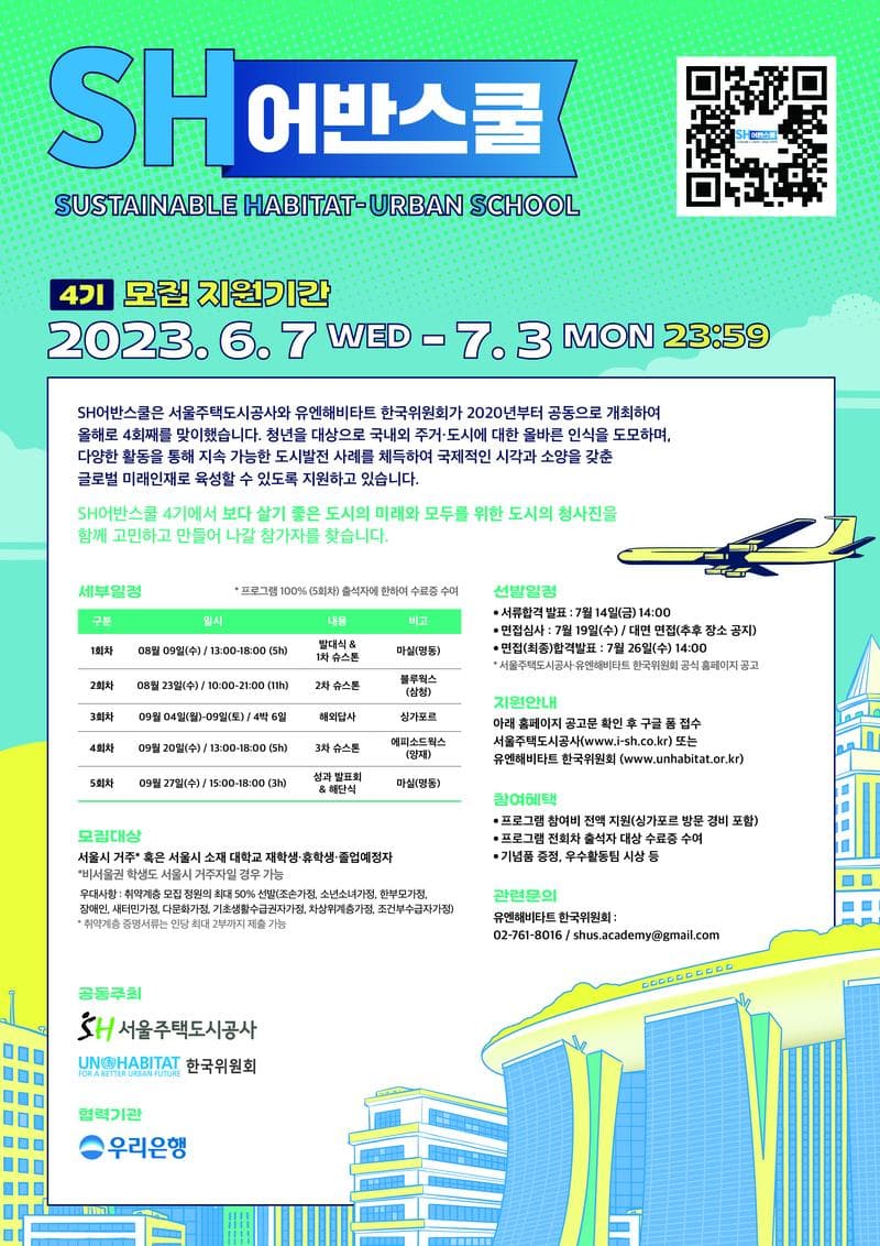❍ 프로그램 개요 ▶ 프로그램명: SH어반스쿨(Sustainable Habitat-Urban School) 4기 ▶ 공동개최: 서울주택도시공사 & 유엔해비타트 한국위원회 ▶ 협력기관: 우리은행 ▶ 프로그램 소개 : 2020년부터 서울주택도시공사와 유엔해비타트 한국위원회는 주거·도시에 대한 청년들의 올바른 인식을 도모하며 지속가능한 도시발전 사례를 체득하고 국제적인 시각과 소양을 갖춘 글로벌 미래인재를 육성해 나가고자 ‘SH어반스쿨(Sustainable Habitat-Urban School)’을 공동으로 개최하고 있습니다. 올해 8월부터 2개월간 진행되는 4기 프로그램은 주거도시와 국제협력 등 다양한 분야의 전문가들과 함께 슈스톤(SH어반스쿨의 팀프로젝트)을 진행하고 싱가포르 해외답사에서 직접 국제 도시발전 경험을 습득하는 커리큘럼으로 구성되어 있으며, 모두가 도시권을 누릴 수 있는 “모두를 위한 도시”에 대해 다각도로 접근하고 직접 서울에 프로젝트를 제안하는 기회를 제공합니다. 서울주택도시공사와 유엔해비타트 한국위원회가 함께 지속가능한 주거·도시에 대해 고민하고 그 청사진을 만들어 가고자 하는 서울시 대학생 여러분들의 많은 관심과 지원 바랍니다. ▶ 교육기간: 2023년 8월 9일(수) \~ 9월 27일(수) / 약 2개월 ▶ 세부일정: