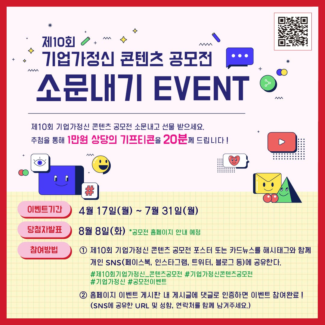 [이벤트 참여방법] 1) 제 10회 기업가정신 콘텐츠 공모전 포스터 또는 카드뉴스를 해시태그와 함께 개인 SNS(페이스북, 인스타그램, 트위터, 블로그 등)에 공유한다. 해시태그 : # 제10회기업가정신_콘텐츠공모전 #기업가정신콘텐츠공모전 #기업가정신 #공모전이벤트 2) 홈페이지 이벤트 게시판 내 게시글에 댓글로 인증하면 이벤트 참여완료! (SNS에 공유한 URL 및 성함, 연락처를 함께 남겨주세요)