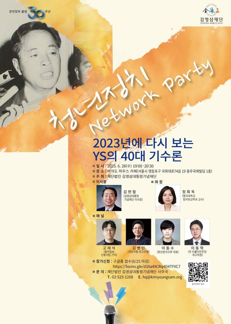 - 주제: 2023년에 다시 보는 YS의 40대 기수론 - 일시: 2023년 6월 28일(수) 19:00-20:30 - 장소: 여의도 하우스 카페(서울시 영등포구 국회대로74길 19 동우국제빌딩 1층) - 주최: 재단법인 김영삼대통령기념재단