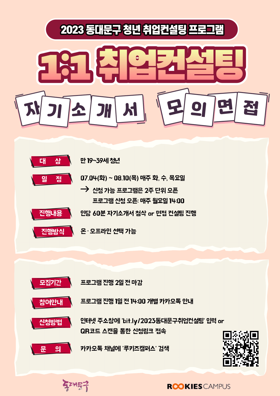 2023 동대문구 청년 취업컨설팅 OPEN! <자기소개서 & 모의면접> 취업 전문 컨설턴트로부터 개별 맞춤 첨삭 & 컨설팅 받을 수 있는 시간! 언제? 07.04(화) \~ 08.10(목) 매주 화, 수, 목요일 - 신청 가능 프로그램은 2주 단위 오픈 - 프로그램 신청 오픈: 매주 월요일 14:00 어디서? 실시간 온라인(zoom) or 오프라인 진행 - 오프라인 진행 장소: 동대문구답십리도서관(2호선 신답역 or 5호선 답십리역 부근) 무엇을? 인당 60분 컨설팅 진행(50분 1:1 컨설팅 + 10분 마무리) 자기소개서 첨삭 or 모의면접 중 선택 가능