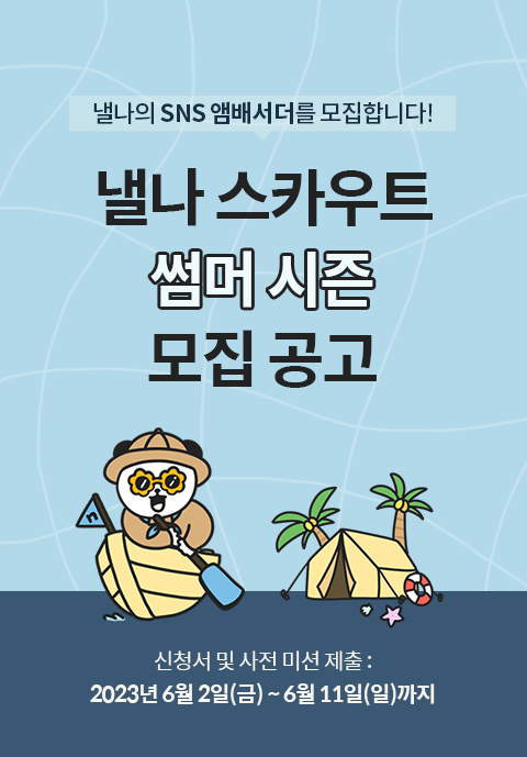 신청서 링크 : https://nelna.shop/2023nelnascout_summerseason**낼나 SNS 앰배서더 낼나 스카우트 썸머시즌 모집