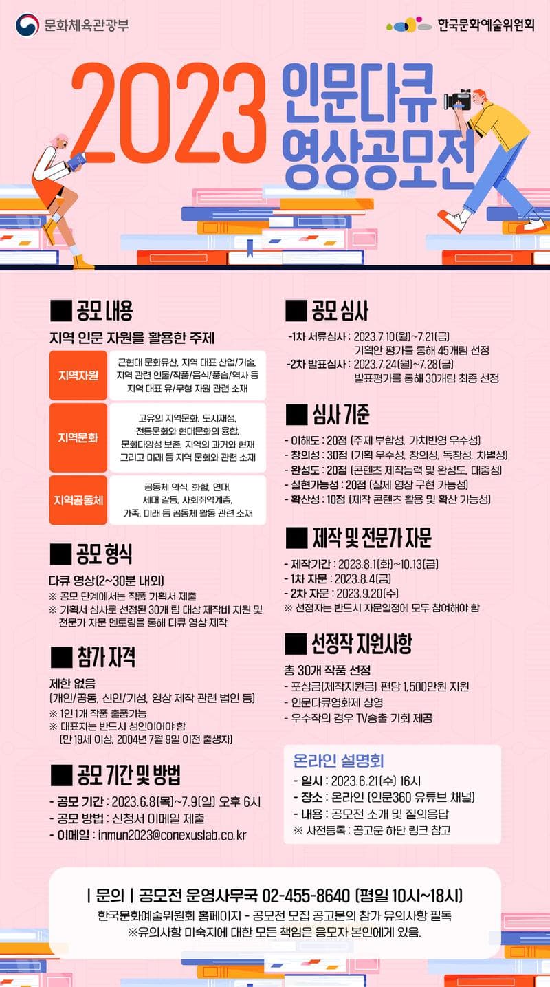 1) 접수 및 심사 ① 6.8(목)\~7.9(일) 18시: 신청서 및 기획안 접수 ② 7.10(월)\~7.21(금): 1차 심사(서류평가) - 접수된 기획안 전체 평가를 통해 2차 심사 대상 선정(45개 이내) ③ 7.24(월)\~7.28(금): 2차 심사(발표평가) - 서류평가 통과작의 발표평가를 통해 최종 선정작 선정(30개 이내) ④ 7.31(월): 최종 선정작 공지(30개 이내) ※ 상기 일정은 응모작의 수 및 심사상황에 따라 일부 변동 가능 2) 제작 및 전문가 자문 ① 8.1(화)\~10.13(금): 선정된 기획안을 바탕으로 영상 제작기간 ② 8.4(금): 1차 자문(OT) - 주제 이해도 향상을 위한 강의와 현업 제작 전문가의 영상 제작 자문 ③ 9.20(수): 2차 자문(중간보고회) - 가편집본에 대한 2차 자문 진행 ※ 선정자는 반드시 1차 자문(오리엔테이션), 2차 자문(중간보고회) 등 주요일정에 참여해야 함 3) 선정작 확산 ① 10.23(월)\~10.27(금): ‘인문 다큐 영화제’ 상영 ② 11월 중: 우수작의 경우 케이블 TV 또는 IPTV채널 송출, 인문 360 채널(홈페이지, 유뷰트)을 활용하여 배포 ※ 선정자는 반드시 인문 다큐 영화제 등 주요일정에 참여해야 함 4. 유의사항 공고문 & 한국 문화예술 위원회 홈페이지 공지사항 참고 (https://www.arko.or.kr/board/view/4013?bid=463&page=&cid=1806367&sf_icon_category=cw00000019) * 유의사항 미숙지에 대한 책임은 참가자 본인에게 있음 5. 문의사항 -공모전 운영사무국: 02-455-8640 (평일 10:00\~18:00) -메일: inmun2023@conexuslab.co.kr