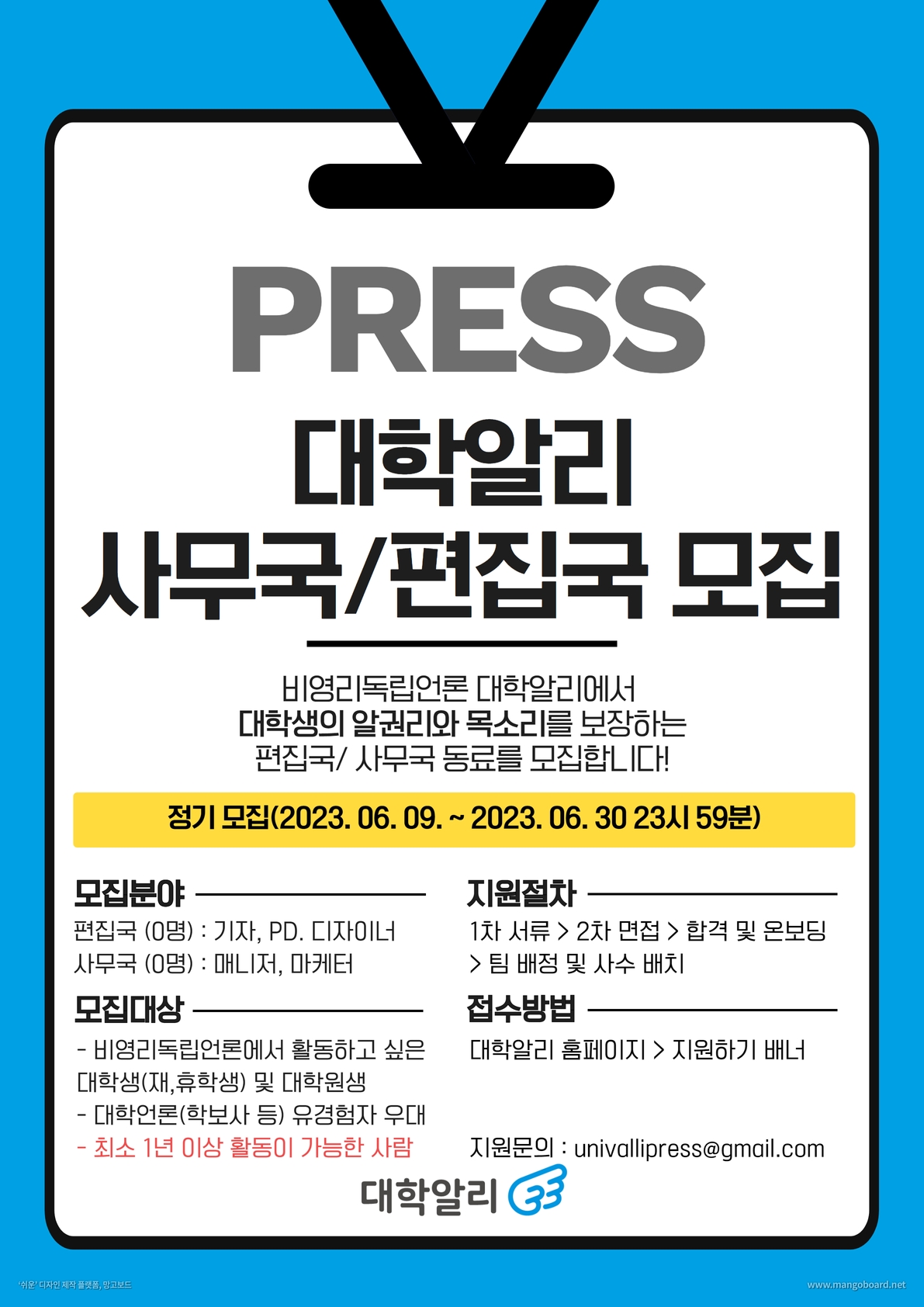 🔥 대학알리 홈페이지 www.univalli.com 🔥 대학알리 노션 바로가기 https://www.notion.so/univalli/4a32d72778264a34812576be7f7fc5c3   👉대학알리가 무엇인가요? <대학알리>는 학교에 소속된 학보사라는 한계를 넘어 대학으로부터 자유로운 편집권을 가지고 언론자유를 실현하기 위해 창간되었으며, 보다 건강한 대학 공동체를 위해 대학생의 알 권리와 목소리를 보장하는 비영리독립언론입니다. 공익을 위한 대학생들의 연대체이자 비영리 민간단체 활동 플랫폼의 성격을 가지고 있으며. 대학 별 독립언론 \대알리\\>를 창간하고 네트워크를 운영합니다. 알리는 1. '알 권리', '알리다'의 준말 2. 영어 '연대'(Alliance) 3. 이탈리아어 '날개'(Alli) 라는 뜻을 담고 있습니다. <대학알리>는 대학생 당사자가 기자가 되어 대학 본부의 편집권 침해와 대학 공동체의 폐쇄성으로 인해 기존 대학언론과 기성 언론이 알리지 못했던 대학 및 청년사회의 문제와 이야기를 조명하여 문제 해결의 단초를 제공하고 대학생 및 청년의 서사를 담는 것을 목적으로 합니다.   저희는 대학사회의 문제를 짚습니다. 학교에서 이야기하지 않는 학내이슈를 다룹니다. 정형화된 편집권과 써야 하는 기사에 염증을 느낀 사람들이 모였습니다. 학내 등록금 문제, 예술대학의 실태, 학내 커뮤니티 이슈 등을 다뤘습니다. 기성 언론이 말하지 않는 대학 및 청년사회 문제와 이야기를 발굴하고, 해결의 단초를 제공하며, 대학생과 청년의 이야기를 담습니다. 이 외에도 비건, 퀴어, 여성, 장애 등 사회의 사각지대에 사는 이들을 조명하는 콘텐츠를 발행합니다. 하고 싶은 이야기가 많은, 날카롭고 예민한 분들을 기다립니다. 쓰고 싶은 글, 찍고 싶은 영상을 마음껏 기획해 주세요!   👉 모집 분야 편집국 - 기자 : 취재, 기사 작성으로 알리와 함께 콘텐츠를 만들어나갑니다. 의제 발굴 능력을 갖춘 분을 환영합니다. - PD : 기획, 촬영, 편집으로 알리만의 색깔을 가진 영상을 만들어나갑니다. 에프터이펙트, 프리미어 프로를 다룰 줄 아시는 분을 우대합니다. - 디자이너 : 디자인으로 알리 콘텐츠의 품질을 향상시킵니다. 포토샵, 일러스트레이터, 인디자인 등을 다룰 줄 아시는 분을 우대합니다.   사무국 - 매니저 : 경영, 홍보, 모금 등 알리를 함께 꾸려나갑니다. 단체를 직접 운영하는 데에 관심 있으신 분을 기다립니다. - 마케터 : 대학알리의 콘텐츠를 널리 알려주실 분을 구합니다. 대학알리의 소셜미디어 관리 등 홍보 전반을 책임지게 됩니다.   👉 모집 절차 서류 제출 > 서류 심사 > 합격 및 면접 안내 > 면접 심사 > 최종 합격 안내 및 온보딩 진행   👉 모집 기간 202369일부터 2023630일 23시 59분까지   👉 이런 분과 함께하고 싶습니다. 대학, 청년사회의 이야기를 취재하는 데 관심이 많으신 분 소수자의 목소리에 귀 기울일 수 있는 분 대학언론을 퇴직하고 남은 학기 동안 활동할 곳을 찾으시는 분 기자, PD 등을 지망하는데 포트폴리오와 실력을 쌓을 곳을 찾으시는 분 언론사나 비영리단체를 직접 만들어나가는 경험을 해보고 싶으신 분 *휴학생, 재학생 무관 *대학언론 유경험자 우대   👉 메리트는 아래와 같습니다. 대학알리는 당신과 연대하는 공동체입니다. 다양한 사람들이 즐겁게 활동하며 배우고, 성장하고 있습니다. 내가 쓴 기사가 포털사이트와 소셜미디어에 유통되며, 다른 플랫폼에도 자유롭게 올릴 수 있습니다. 단체가 대외적으로 맺은 파트너십을 활용하여 성장의 기회를 얻어갈 수 있습니다. 단체 명의로 계약된 콘텐츠 제작 툴, 네트워킹 및 교육, 공유오피스, 법률 지원 등을 활용할 수 있습니다. 사무국의 판단 하에 취재지원비를 지원합니다. 명함, 뱃지, 스티커 등 프레스키트를 지급합니다. 1년 이상 활동 시 활동증명서를 발행할 수 있습니다.   👉 문의 방법은 이렇습니다. 페이스북에 '대학알리' 페이지를 검색하여 문의 인스타그램에 'univallipress' 계정을 검색하여 문의 대학알리에 이메일(univallipress@gmail.com) 보내기