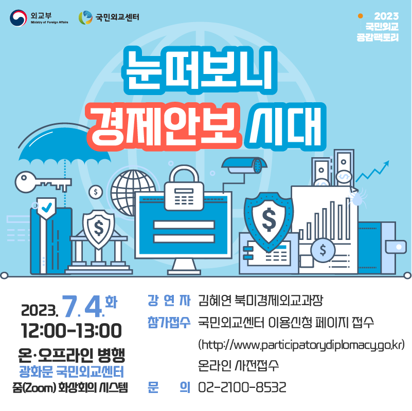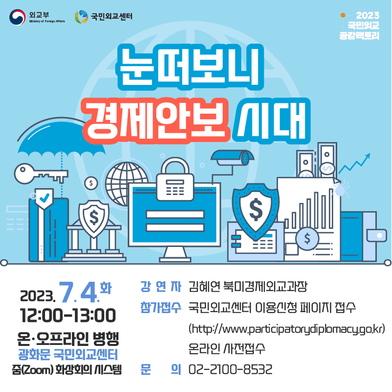 외교부는 7월 4일(화) 12:00-13:00 “눈떠보니 경제안보 시대" 를 주제로 국민외교 공감팩토리를 개최할 예정입니다. 이번 행사는 온오프라인 병행으로 진행되며, 오프라인 참여를 희망하시는 분들은 운영사무국(070-4128-2794) 로 별도 연락 부탁드립니다. 많은 관심과 참여를 부탁드립니다.