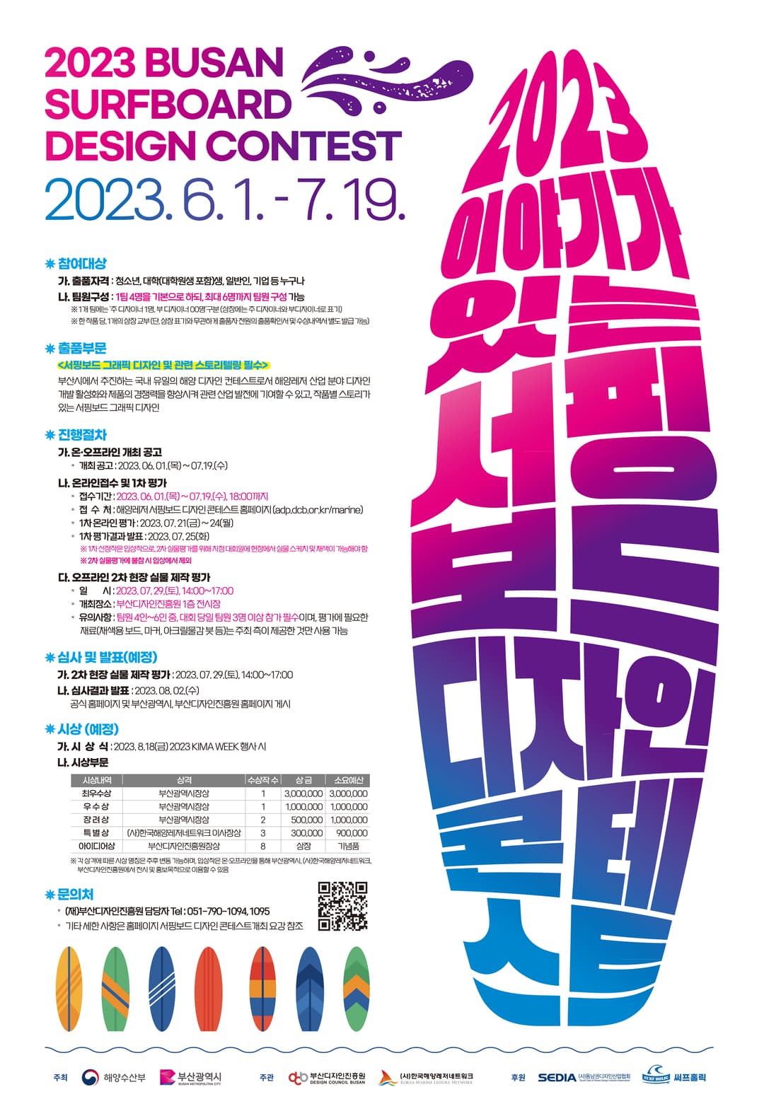 1. 공모개요 가. 공모명 : 이야기가 있는 서핑 보드 디자인 콘테스트 나. 주 최 : 해양수산부, 부산광역시 다. 주 관 : (사)한국해양레저네트워크, (재)부산디자인진흥원 라. 후 원 : (사)동남권디자인산업협회, 서프홀릭 마. 공모기간 : 2023. 06. 01.(목) \~ 2023. 07. 19.(수)