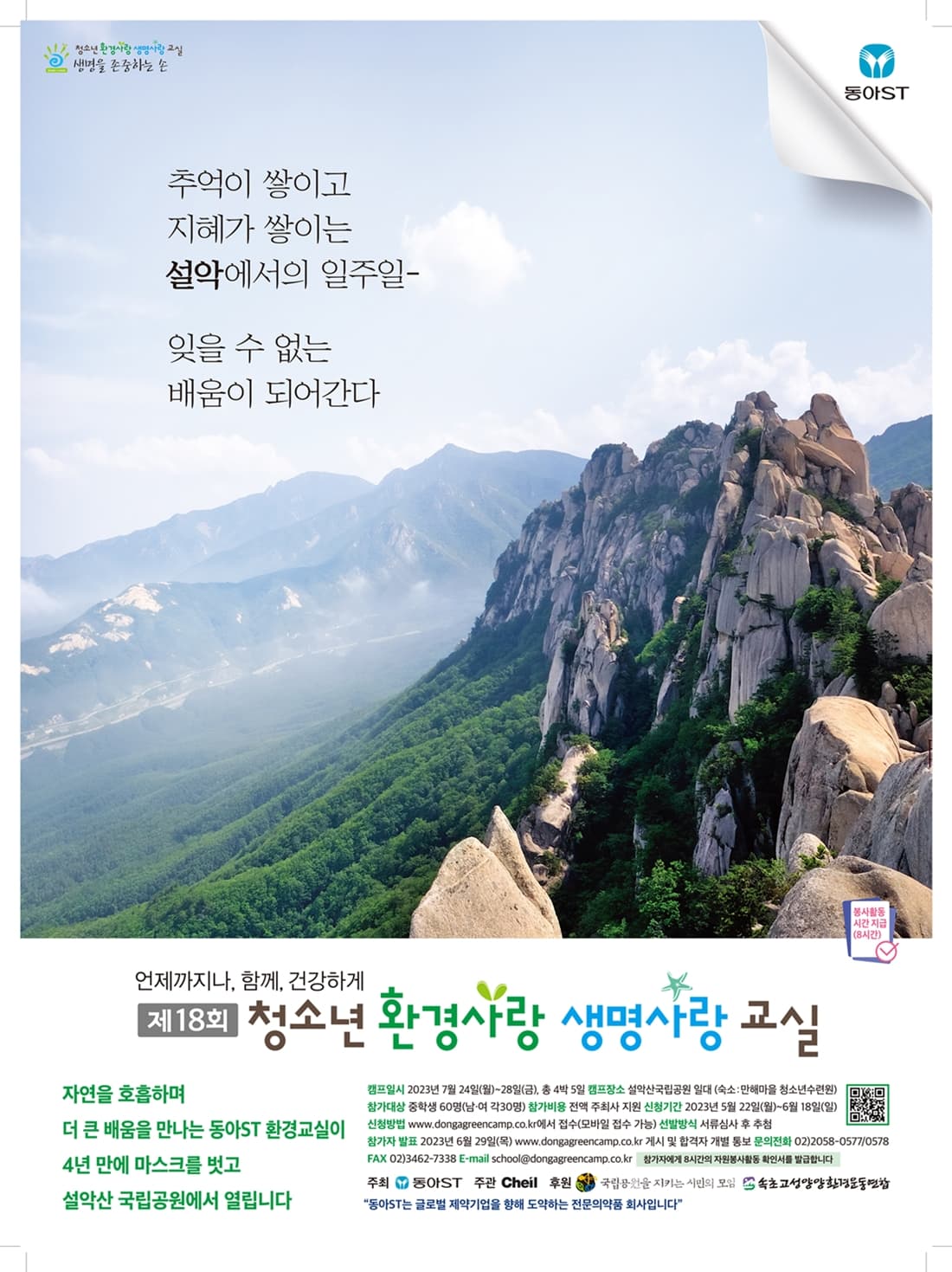 ● 행사 개요 - 행사명 : 제18회 청소년 환경사랑 생명사랑 교실 - 장소 : 강원도 인제군 (숙소 - 동국대학교 만해마을 청소년수련원) - 참가인원 : 전국 남\,여 중학생 60명 (각 30명) - 참가비 전액 주최사 지원(무료) / 봉사활동 8시간 확인서 발급 - 주최 : 동아ST - 주관 : 제일기획 - 후원 : 국립공원을 지키는 시민의 모임 / 속초고성양양 환경운동연합 - 운영 : 크리에이터즈