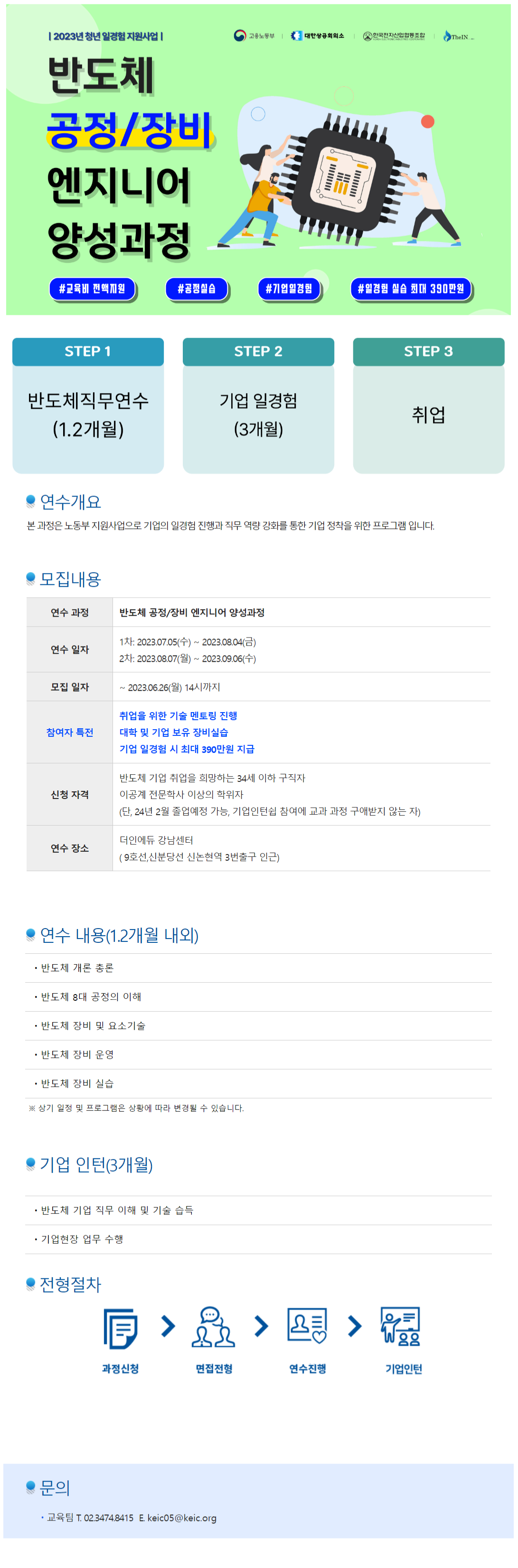 ● 지원 자격 -반도체기업 취업을 희망하는 34세 이하 구직자 -이공계 전문학사 이상의 학위자 (단, 24년 2월 졸업 예정자 가능, 교과 과정 동안 일경험 참여에 구애받지 않는 자) ● 지원 방법 https://edu.thein.kr/thein/member/courseDetail?degreeIdx=103
