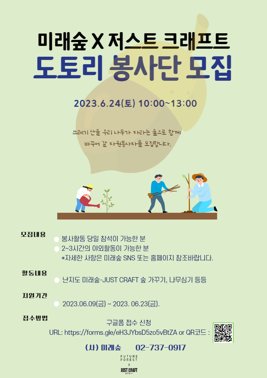 6월 도토리 봉사단 일정입니다! 봉사 일자 : 2023.6.24(토) 오전 10시 \~ 1시(3시간) 봉사 장소 : 서울시 난지도 노을공원 – 접수방법 – https://forms.gle/eH3JYbsD5zo5vBtZA 많이 참여 해주세요\~
