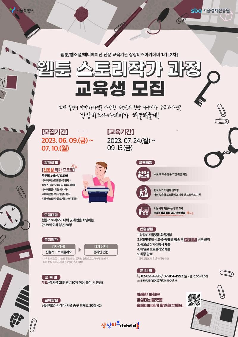 안녕하세요. 서울경제진흥원 상상비즈아카데미 운영 사무국입니다. 웹툰 스토리작가 취업을 희망하는 청년분들을 대상으로 교육생을 모집하고 있습니다. 수료 후 소재/직업 특화 명사 초빙강의, 현직 웹툰 작가 멘토링 등 지원을 할 예정이오니, 많은 관심 부탁드립니다!