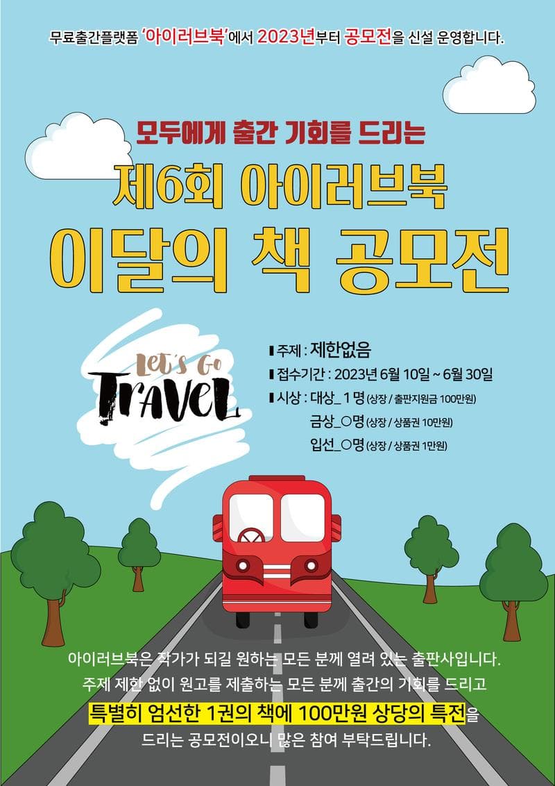 제 6회 아이러브북 <이달의 책> 공모전 ■ 공모 주제 자유 주제 -책으로 만들 수 있는,내용이 완결된 원고(용지 규격 자율, 출력(인쇄)기준 분량 20페이지 이상) -장르 제한 없음 ■ 공모 내용 아이러브북은 장르제한 없이, 작가 자격 제한 없이 작가가 되길 원하는 모든 분께 열려 있는 출판사입니다. 이번 공모전은 공모전에 원고를 제출하는 모든 분께 출간의 기회와 함께 총 200만원 상당의 출간 지원혜택을 드립니다. (시상 내역 참고) 많은 참여 부탁드립니다. ■ 지원 자격 -책을 출간하여 작가가 되고 싶은 남녀노소 누구나 *이전회차 공모전에 지원했던 사람도 동일 작품 아니면 지원 가능 *다른 출판사에서 출간했던 책도 계약기간이 끝났을 경우 지원 가능 ■ 모집 기간 2023년 6월 10일 (토) \~6월 30일 (금) 발표일:7월 17일 (월) 개별연락 ■ 지원 방법 1) 홈페이지 공지사항 클릭 https://ilovebook.co.kr/board/notice/read/19 또는 네이버 폼 https://naver.me/xw91RlCO 접수 (6월 10일부터 접수) 2) ilovebook7979@naver.com 메일로 접수 (사전접수 가능) ■ 활동 혜택 지원자 전원 책 출간 기회 부여 ■ 시상내역 대상 출판지원금 100만원 (금액 한도 내에서 책 표지 제작, 삽화 제작, 추가 인쇄 등 수상자가 원하는 형태로 출판 지원, 단 자사에서 출판하는 것을 전제로 함) 금상 o명 (상품권 10만원) 입선 o명 (상품권 1만원) ■ 문의 사항 *공모전 문의 이메일 ilovebook7979@naver.com/ 전화 051-622-6669 *네이버폼 또는 메일로 원고 파일 제출 시 이름과 연락처, 주소를 반드시 적어주시기 바랍니다. *공모전 참가자 모두에게 출판의 기회를 드립니다. *원고 제출하시되, 파일명에 작가 이름과 제목 필수 표기 바랍니다.