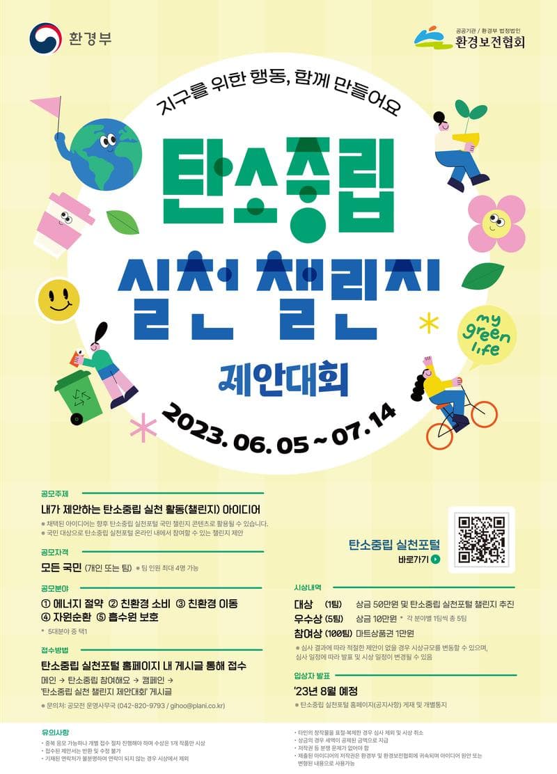 📌공모주제 내가 제안하는 탄소중립 실천 활동(챌린지) 아이디어 ※ 채택된 아이디어는 향후 탄소중립 실천포털 국민 챌린지 콘텐츠로 활용될 수 있습니다. ※ 국민 대상으로 탄소중립 실천포털 온라인 내에서 참여할 수 있는 챌린지 제안 ✏️응모기간 2023년 6월 5(월) \~ 7월 14일(금) ✏️공모자격 모든 국민(개인 또는 팀)※ 팀 인원 최대 4명 가능 ✏️공모분야 ①에너지 절약, ②친환경 소비, ③친환경 이동, ④자원순환, ⑤흡수원 보호 (5대분야 중 택1) ✏️입상자 발표 ‘23년 8월 예정 ※ 탄소중립 실천포털 홈페이지(공지사항) 게재 및 개별통지 ✏️시상 내역 - 대상(1팀) : 상금 50만원 및 탄소중립 실천포털 챌린지 추진 - 우수상(5팀) : 상금 10만원 *각 분야별 1팀씩 총 5팀 - 참여상(100팀) : 마트상품권 1만원 ※ 심사 결과에 따라 적절한 제안이 없을 경우 시상규모를 변동할 수 있으며, 심사 일정에 따라 발표 및 시상 일정이 변경될 수 있음 ✏️접수방법 탄소중립 실천포털 홈페이지 내 게시글 통해 접수 👉 https://www.gihoo.or.kr/zerolife (탄소중립 실천포털 홈페이지) 👈 (메인>탄소중립 참여해요>캠페인>‘탄소중립 실천 챌린지 제안대회’ 게시글) - 한글파일 양식 다운로드 후 작성 및 홈페이지에 제출 - 제출서류 : 챌린지 아이디어 제안서 1부 (접수된 제안서는 반환 및 변경불가) - 문의처: 공모전 운영사무국 (gihoo@plani.co.kr)