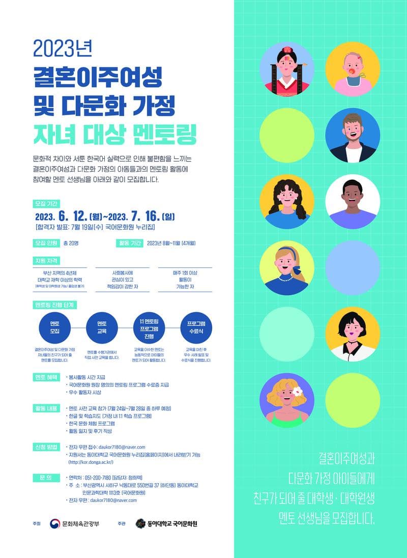 결혼이주여성과 다문화 가정 아이들에게 친구가 되어 줄 대학생 · 대학원생 멘토 선생님을 모집합니다. 문화적 차이와 서툰 한국어 실력으로 인해 불편함을 느끼는 결혼이주여성과 다문화 가정의 아동들과의 멘토링 활동에 참여할 멘토 선생님을 아래와 같이 모집합니다.