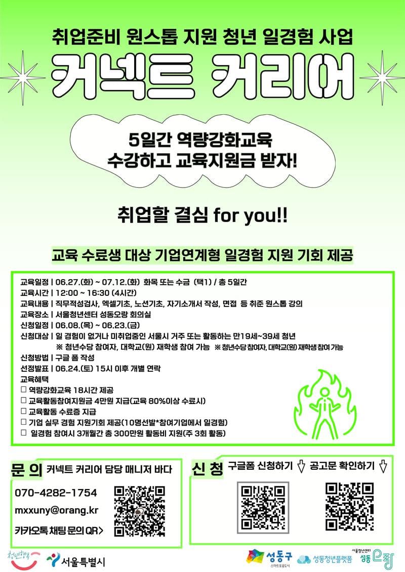 🔸신청일정 \| 06.08.(목) \~ 06.23.(금) 🔸신청대상 \| 일 경험이 없거나 미취업중인 서울시 거주 또는 활동하는 만19세\~39세 청년 ※ 청년수당 참여자, 대학교(원) 재학생 참여 가능 🔸신청방법 \| 구글 폼 작성 신청링크 > https://forms.gle/Dt142jvon8G51LZW8 🔸선정발표 \| 06.24.(토) 15시 이후 개별 연락 🔸교육혜택 - 역량강화교육 18시간 제공 - 교육활동참여지원금 4만원 지급(교육 80%이상 수료시) - 서울청년센터 성동오랑 센터장 명의 수료증 발급(80%이상 활동 참석 시) - 기업 실무 경험 지원기회 제공(10명선발*참여기업에서 일경험) - 일경험 참여시 3개월간 총 300만원 활동비 지원(주 3회 활동) 🔸확인내용 - 공고문 확인 필수! 공고문 확인 링크 ▶ https://youth.seoul.go.kr/site/main/youth/politics/user/detail/37471 🔸문의 서울청년센터 성동오랑 매니저 바다 카카오톡 문의(링크) : https://open.kakao.com/o/s0Pi9K0d T. 070. 4282. 1754 E. mxxuny@orang.kr