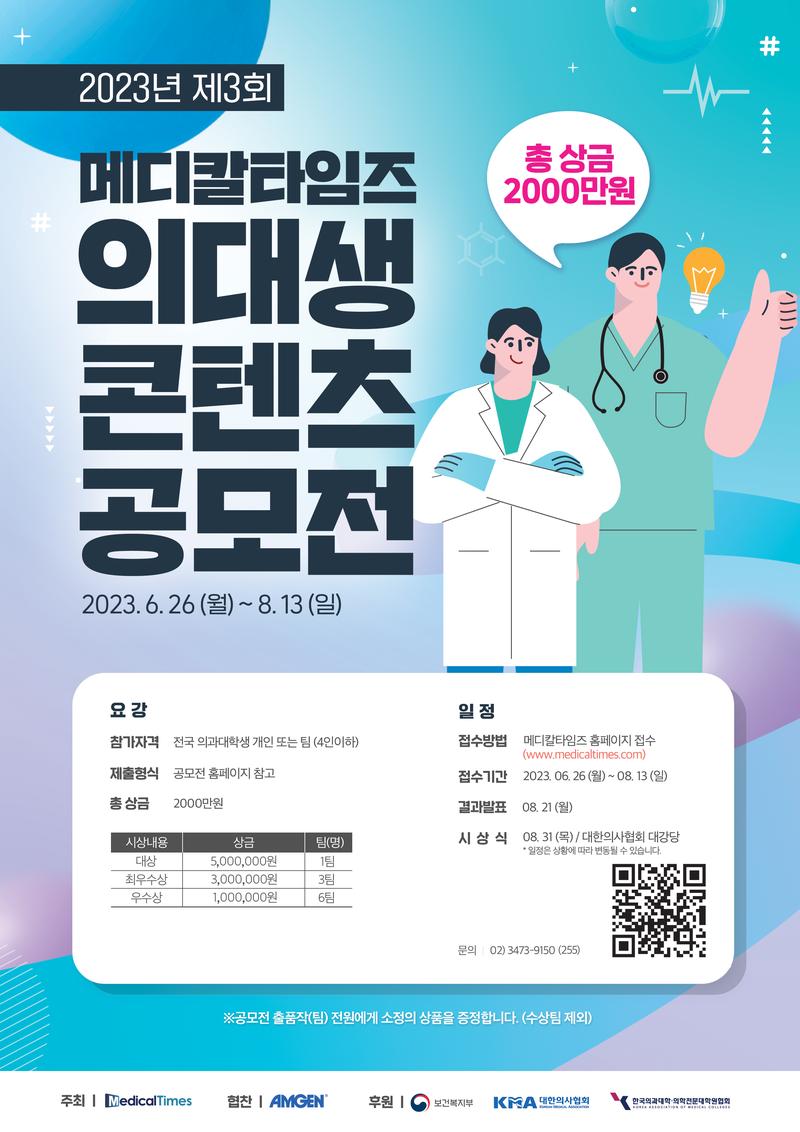 ■ 기간 및 일정 · 접수기간: 2023.06.26(월) \~ 08.13(일) · 발표일자: 2023.08.21(월) · 시상일자: 2023.08.31(목) ■ 참가자격 전국 의과대학교 학생 개인 또는 팀 (4인 이하) ■ 시상내역(총 상금 2000만원) · 대상: 500만원(1팀) · 최우수상: 300만원(3팀) · 우수상: 100만원(6팀) ■ 응모분야 영상 / 웹툰 / 카드뉴스(PPT형식) ■ 참가방법 공모전 홈페이지 접수: https://www.medicaltimes.com/Main/contest/ ■ 작품규격 * 영상 · 분량: 3분 이내 200MB 미만의 영상 · 해상도: 1920*1080(HD) 이상 (휴대폰 촬영으로 공모가능) * 웹툰 · 분량: 8컷 이상 단편 (스토리상 완결된 작품) · 용량: 20MB 미만 · 크기: 가로 690px, 세로길이 무관 · 해상도: 300dpi 이상의 jpg 또는 jpge 파일 * 카드뉴스 · 파워포인트 10장 내외 ■ 협찬 : AMGEN ■ 후원: 보건복지부, 대한의사협회, KAMC ■ 문의: aram@medicaltimes.com
