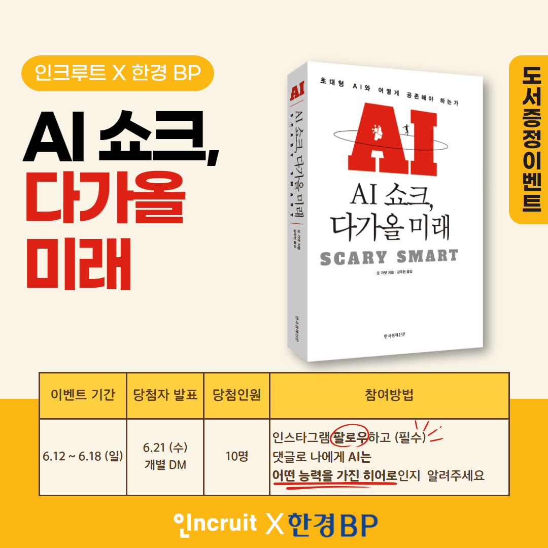 인크루트와 한경BP가 친구들에게 AI에 대한 인사이트를 전해줄 🎉도서 'AI쇼크, 다가올 미래' 1권을 증정합니다🎉