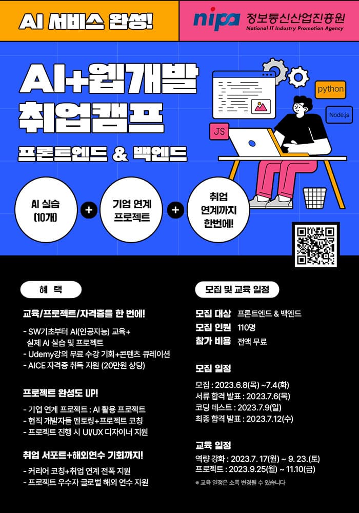 ■ 교육혜택 ✨역량 강화 (10주) ✔ SW 개발 기초부터 AI 실습(10개) (프론트/백엔드 택 1 교육) ✔ 유데미 무료 수강 기회(17,000개↑) + 콘텐츠 큐레이션 제공 ✔ AI 자격증 취득 지원(20만원 상당) ✔ AI 실습 프로젝트 10개 이상 진행! 💌 프로젝트 (7주) ✔ IT 기업 현업 프로젝트 진행 (웅진씽크빅, 놀이의 발견 등 IT 기업) ✔ 팀별 현직 멘토 + UI/UX디자이너 지원 ✔ 현직 개발자 멘토링 & 프로젝트 코칭 ✔ AI 서비스 포트폴리오 완성! 💌 취업 연계 + 해외 연수 기회까지! ✔ 자기소개서 첨삭, 모의 면접, 협력사 취업 연계 등 전격 지원 ✔ 글로벌 해외연수 기회까지(최우수팀 대상)