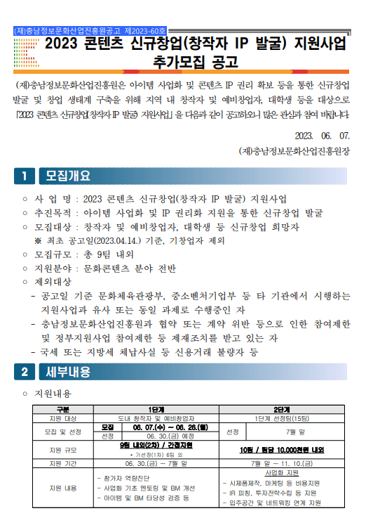 (재)충남정보문화산업진흥원에서 아이템 사업화 및 콘텐츠 IP 권리 확보 등을 통한 신규 창업 발굴 및 창업 생태계 구축을 위해 충청남도 내 창작자, 예비창업자, 대학생을 대상으로 2023 콘텐츠 창작자 IP 발굴 지원사업을 아래와 같이 공고합니다.