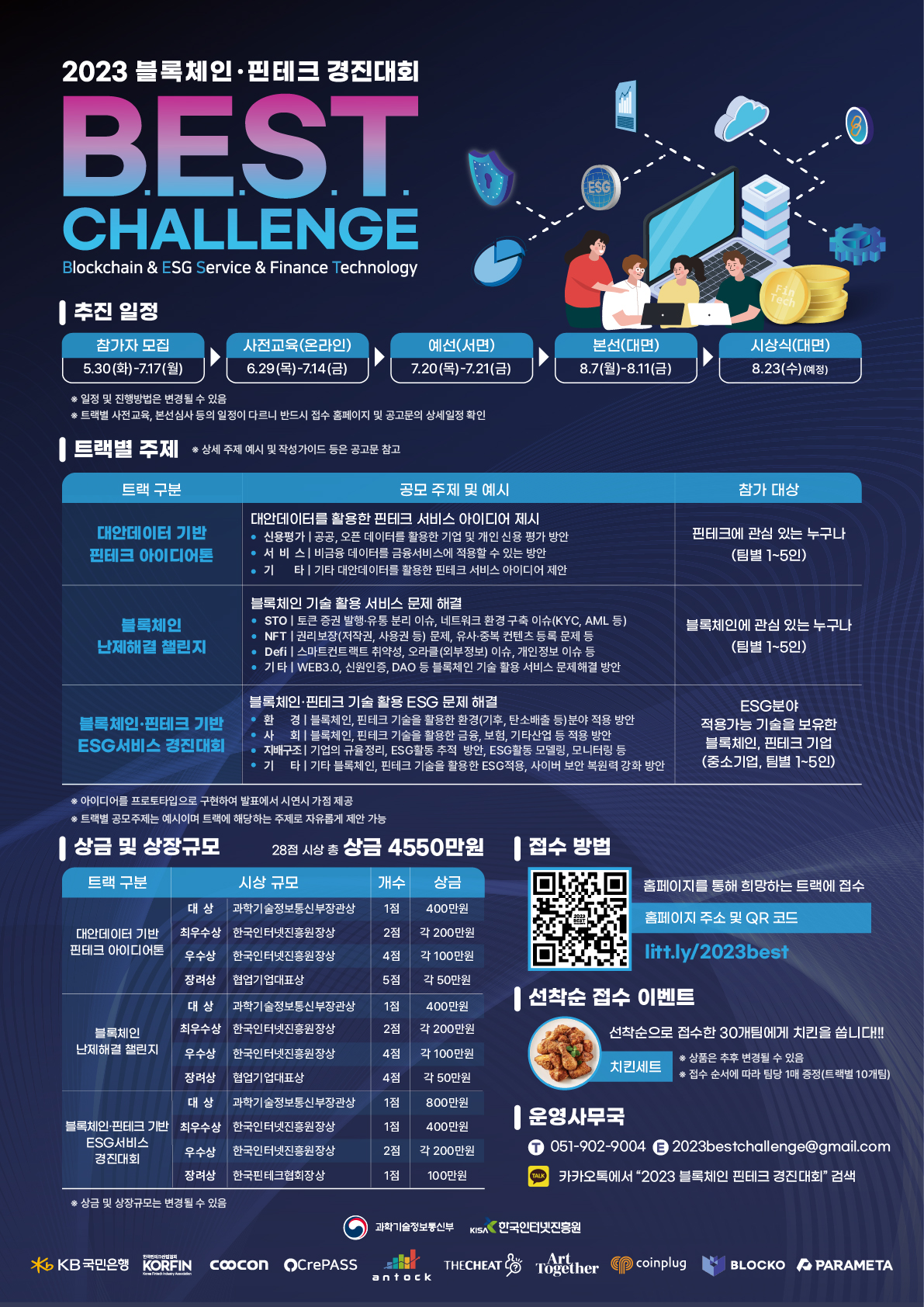 ❏ 참가신청 : https://litt.ly/2023best접속 후 참가를 희망하는 트랙에 접수 (트랙별 선착순 10개팀에 치킨세트 기프티콘 증정)